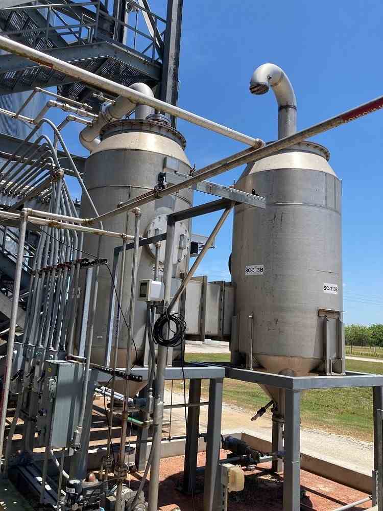 Used 6000 ACFM Exhaust Gas Scrubber system. Manufactured by Clean Gas Systems Inc. (2) 48" cyclonic 304 stainless steel separators. Each unit: 48" diameter x 9'-5.5" OAH. Rated 6000 ACFM @ 86 F. Pressure: 22 PSIA, Gas Density 0.1087 lbs/cu. Ft. Pressure drop: 2.5" W.C. Design pressure: 8 PSIG. Each unit has 16" bolted inspection door, 6" drain, 6" overflow connection, 1/2" NPT coupling for pressure tap, and 3/8" pipe X 6" LG. with NPT CPLG. Plug for pressure tap. Cyclones are connecting in tandem by 16" X 21" flanged connection.