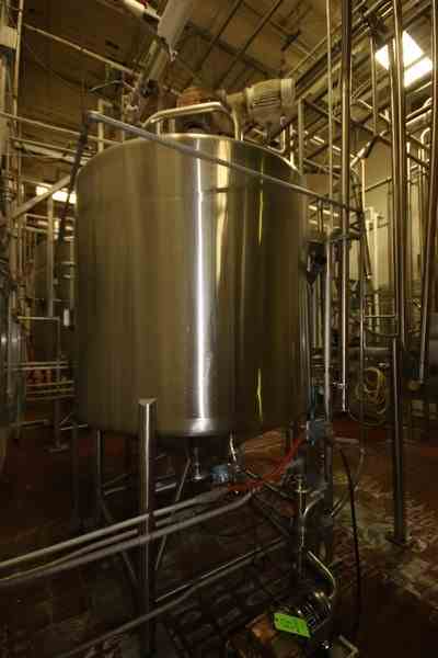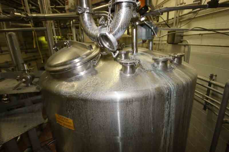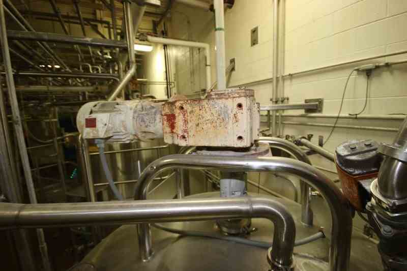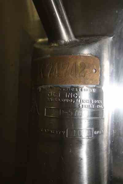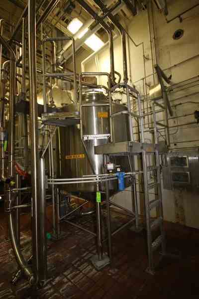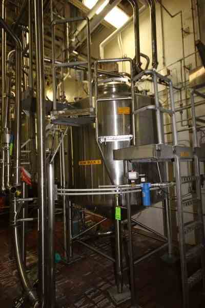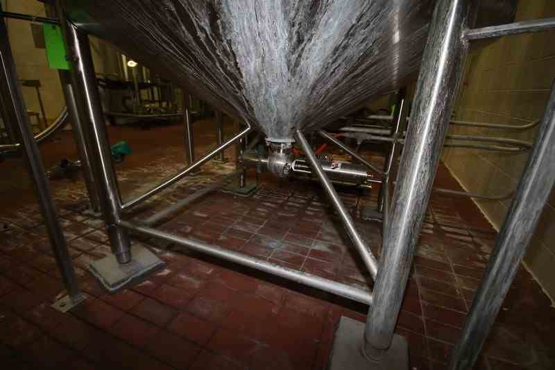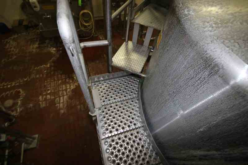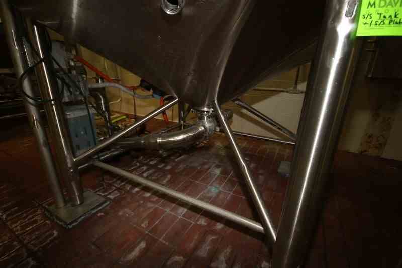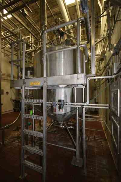 DCI 1,000 Gal. S/S Single Wall Cone Bottom Tank, S/N 98-D-57423, with Reliance 3 hp Top Mounted Agitation Motor, with S/S Side Sweep Agitation, Dome Top, Oveall Height: Aprox. 150" Tall, with S/S Side Platform, with S/S Hand Rails & Grating (SEMI BULK 3)