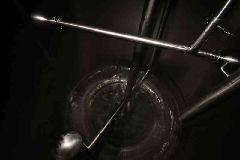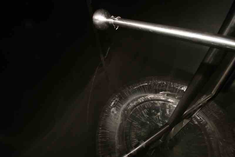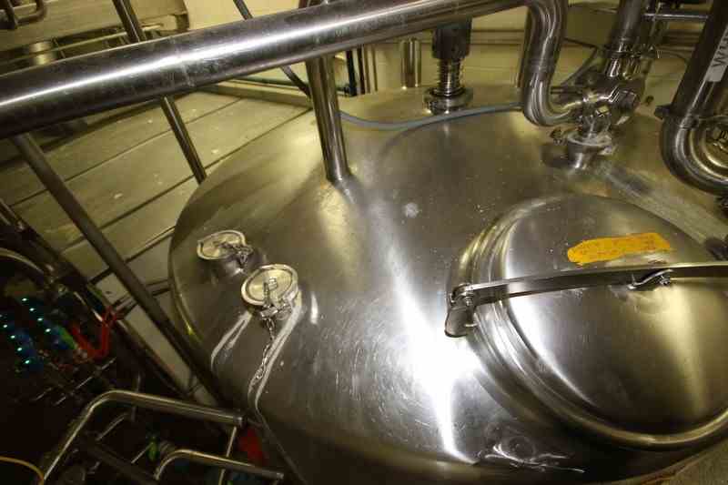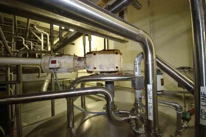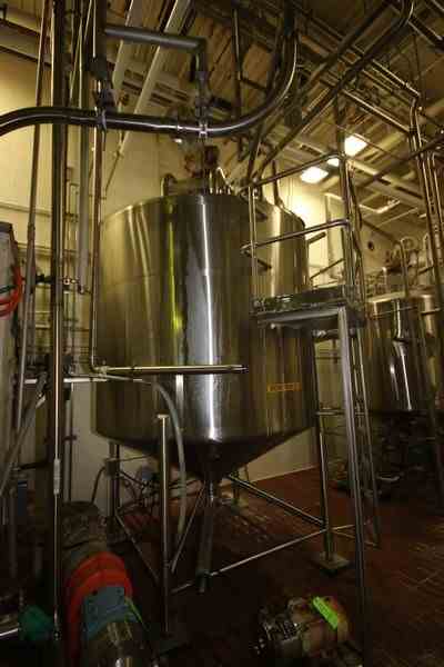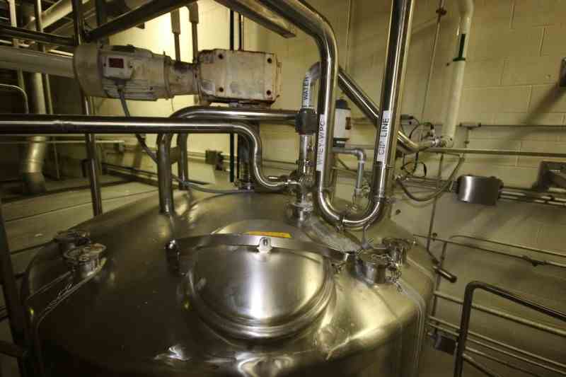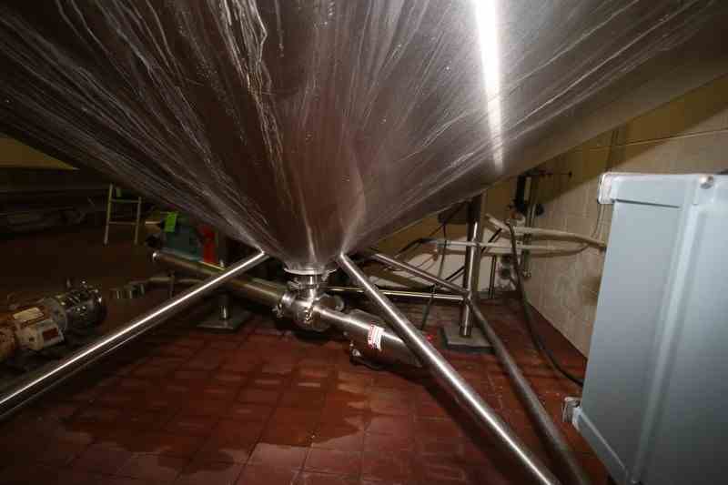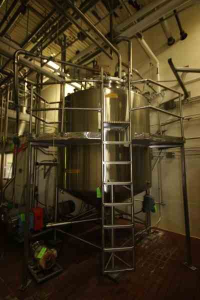 DCI 2,000 Gal. S/S Single Wall Cone Bottom Tank, S/N 98-D-57422-A, with Reliance 5 hp Top Mounted Agitation Motor, with S/S Side Sweep Agitation, with Dual CIP Spray Ball, Dome Top, Overall Height: Aprox. 172" Tall, with S/S Platform with Handrails & Grating, Tank Mounted on S/S Legs & Frame (SEMI BULK 2) (LOCATED IN CHAMPAIGN, IL)