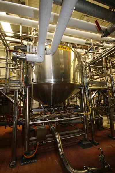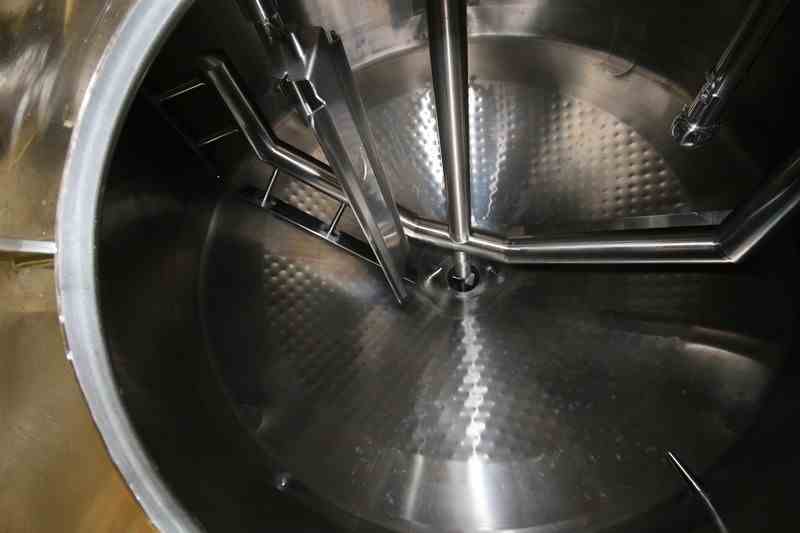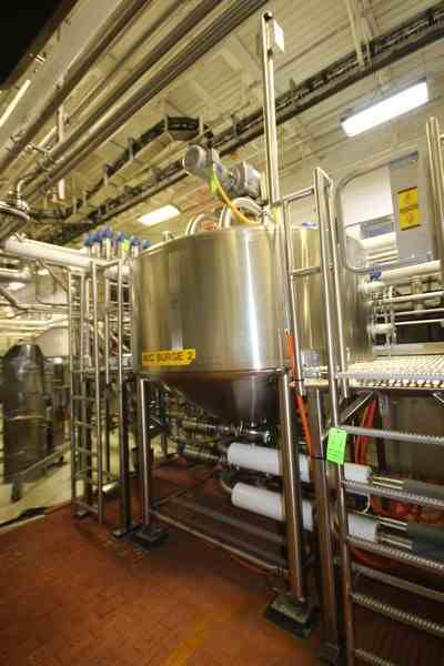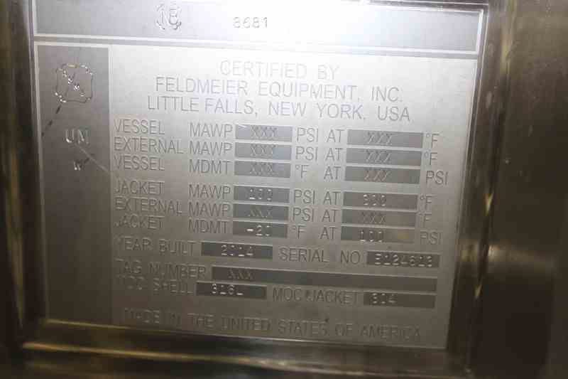 Used 1000 Gallon 316L Stainless Steel Processor. Manfactured by Feldmeier. 304 Stainless Steel Jacket MAWP 100 PSI @ 300 F. 5HP Top Mounted Agitation Motor, 1745 RPM, 208-230/460 Volts, 3 Phase. (2) Internal S/S CIP Spray Balls. 18" Top Manway. Dimenisons: 138"OAH x 84"ID. Mounted on Stainless Steel Legs. Serial #E-1247-13. Weight 3100 lbs.
