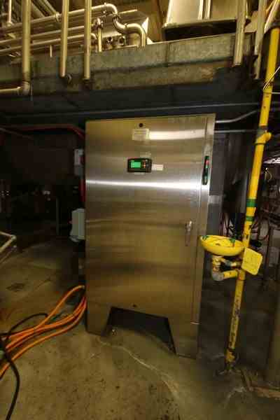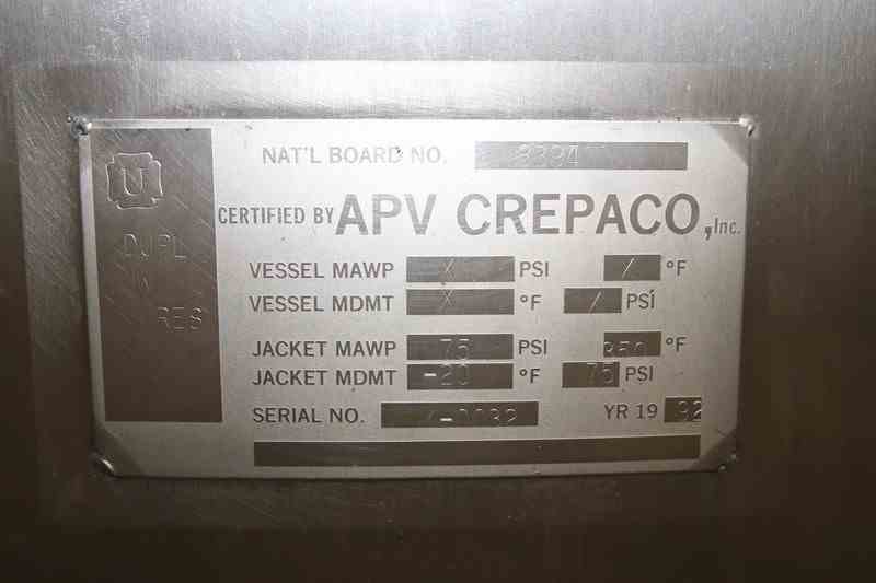 Used 1000 Gallon Stainless Steel Processor. Manufactured by APV. Jacket MAWP 75 PSI @ 350 F. Cone Bottom. Control Panel with Flow Meter. Internal Tank Dims:53" Tall x 73" Dia. Mounted on Stainless Steel legs. National Board #8394. Serial #K-0032.