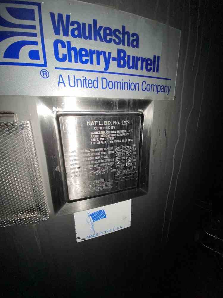Used 7500 Gallon Vertical Jacketed Tank. Manufactured by Cherry Burrell. MAWP Heat Exchanger 220 PSI @ 200F. Top Mounted Vertical Agitation & Agitation Motor Serial# E-216-97. National Board #4705. Built 1997.