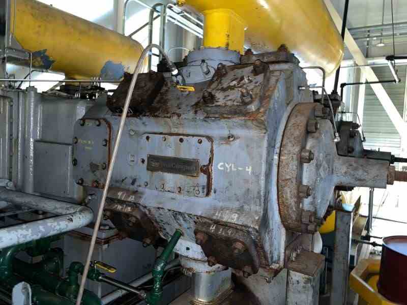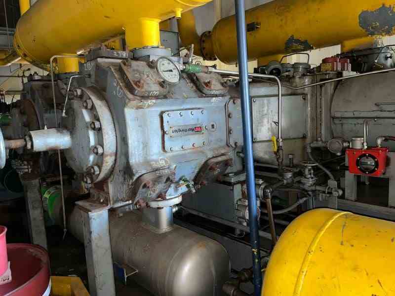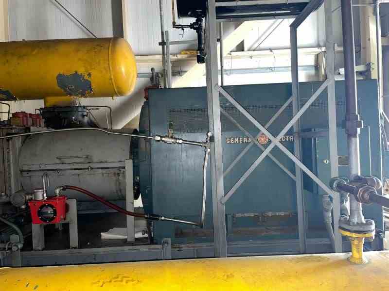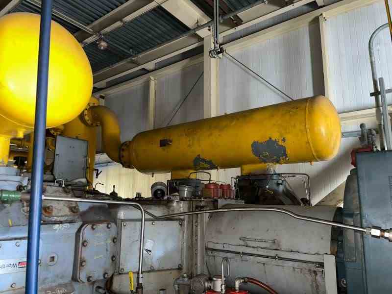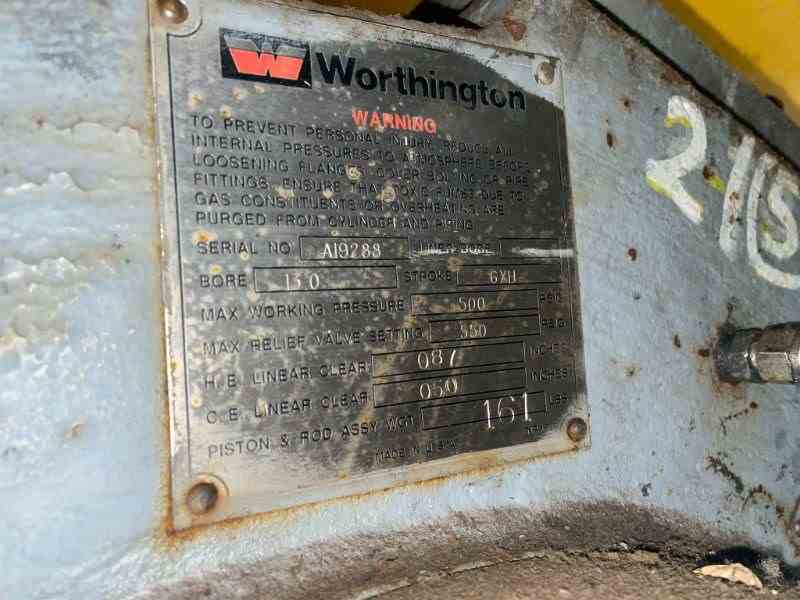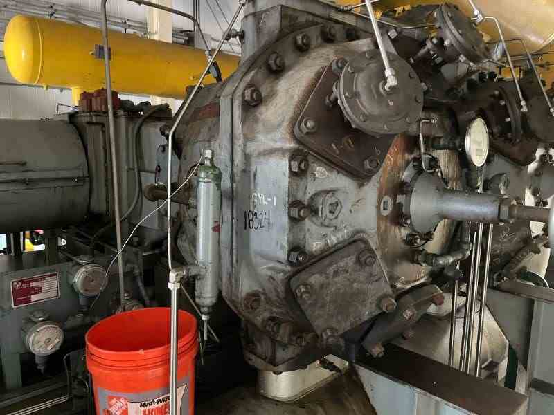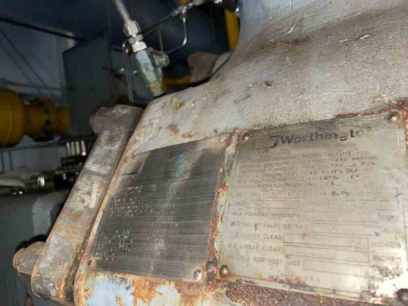 Used Worthington Reciprocating Gas Compressor. Bore 19.50, Stroke 6XH packaged skid, designed for GE 42 mw Frame 6B gas turbine. Inlet gas pressure 150 psig, outlet 400 psig., 9300 SCFM, Serial number A-19285, built 1990. Motor - GE WPI induction motor, Model 8413582401, Serial Number 840269, Type K, Frame 8409S 1500 HP, 885 rpm, 4160 v, 3 phase, 60hz. Service factor 1.15