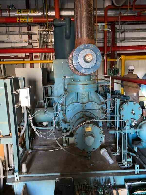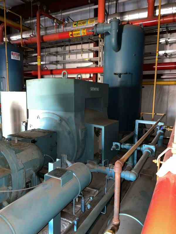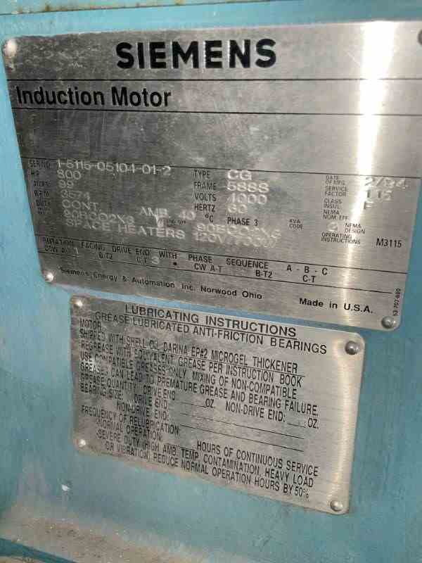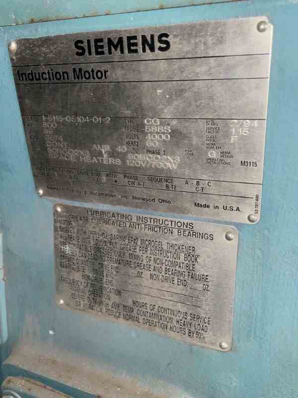 Used 800HP Rotary Screw Compressor. Manfactured by Frick (York). 350PSI@200F. Hours 10397.4. (add 5000Hrs). Touch Controls. Serial #MC93943. Siemens 800 HP Continuous Duty Induction motor. 4000V/60Hz. Serial#1-5115-05104-01-2. Built 1994. w approx 500 gallon 300PSI@200F. National Board #. Built 1994.
