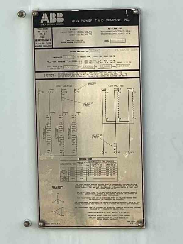 Used 45000 kVa Type SL GSU Transformer. Manufactured by Asea Brown Boveri. 3 phase, 60 Hz, 65C Rise. 7.66% Impedance. Class DA/FA/FA. 13656Y/13800 Delta Volts. 45000/60000/75000 kVA. Serial #MNL5594. Built 1990. Copper Conductors. Core and Coils 77000 lbs, Total 143288.