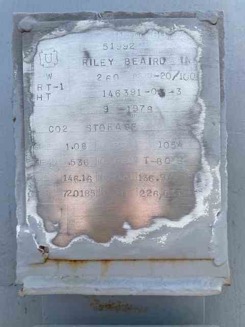 Used 112293 gallon horizonal pressure vessel. Manufactured by Riley-Beaird Inc. Rated 260PSI@100F. 146"OD x 136'OAL. (2) Concrete Saddle mounted. Serial #146391-03-3. National Board #51992. Built 1978. Past use CO2 storage. Quantity 4 available. Weight 221,636 lbs for the bullet and 5,000 lbs for the saddles.