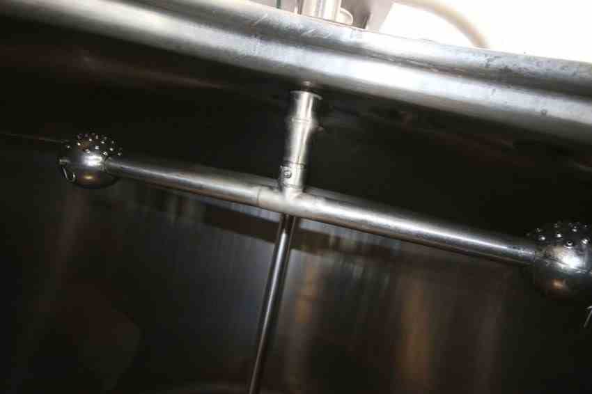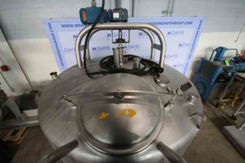 Used 445 gallon Stainless steel mix tank. Manufactured by DCI Inc. 1HP motor with Side Sweep agitation. (2) CIP Balls. Dome Top, Cone Bottom. Center Bottom discharge. Serial #JS458.