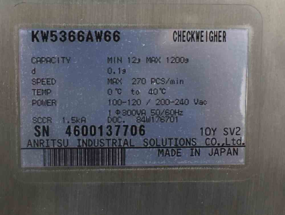 Home » Equipment » Packaging » Checkweighers » Anritsu KW5366AW66 Checkweigher