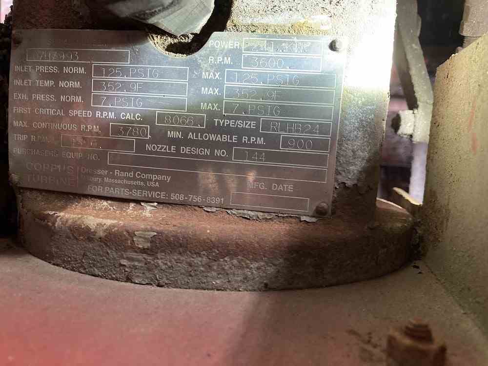 Used 241 kW Dresser-Rand Steam Turbine Generator. Coppus Turbine type RLHB24. Max Cont RPM 3780. 125PSIG @353F Inlet. 7 PSIG Exhaust, 12000 LB/Hr. Serial #07H7993. Disc Coupling Lovejoy Model 158-6. WEG 350 HP 480/3. 260kW. Power Factor 0.91. Frame 447/9TS. Unipak Switch Gear. Also see 19413.