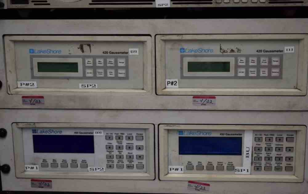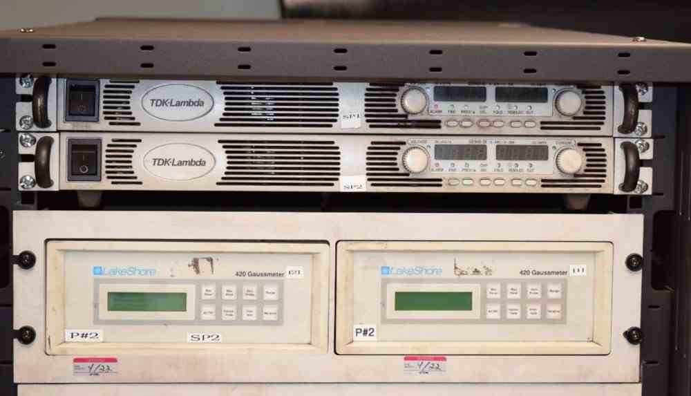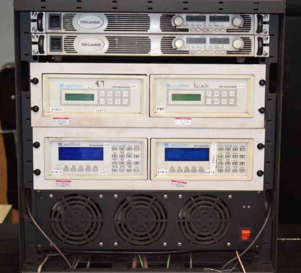 Used Magnetic testing station. With 2 test stations and rack mounted gaussmeters, (2) TDK-Lambda Power supplies, (2) LakeShore model 420 Gaussmeters, (2) LakeShore model 450 Gaussmeters.