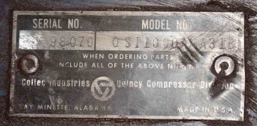 Used 200HP Quincy Air Cooled Compressor. Model QSI1000 ANA31B. With Air receiver. Serial #98070.