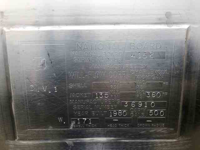 Used 50 Cubic Foot Stainless Steel Jacketed Ribbon Blender. Manufactured by Will Flow Corpn. Jacket pressure: 135PSI @ 360F. Dimensions 34in dia. x 98in long.Serial #36910. National Board #4152. Built 1980.