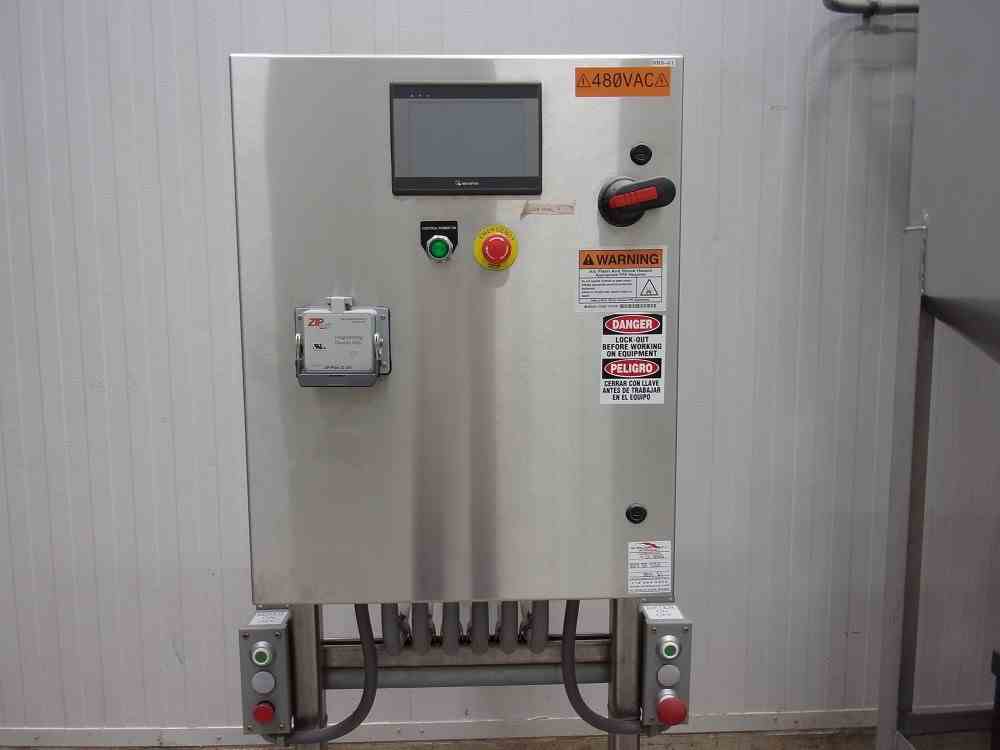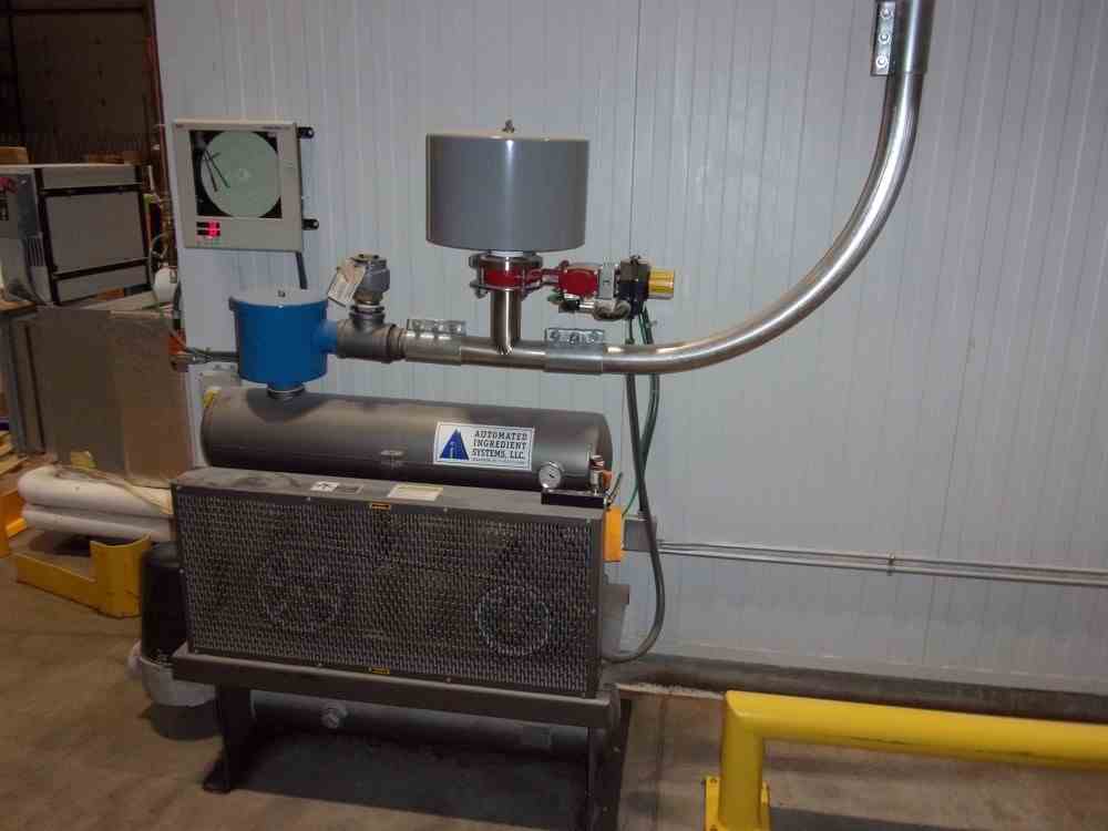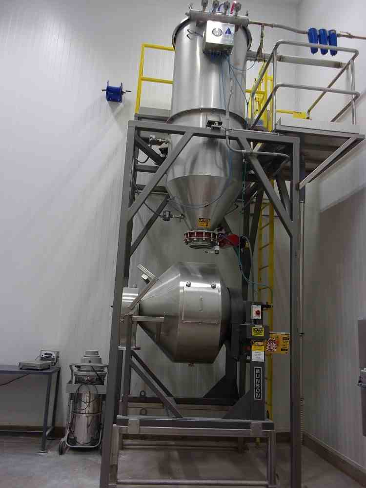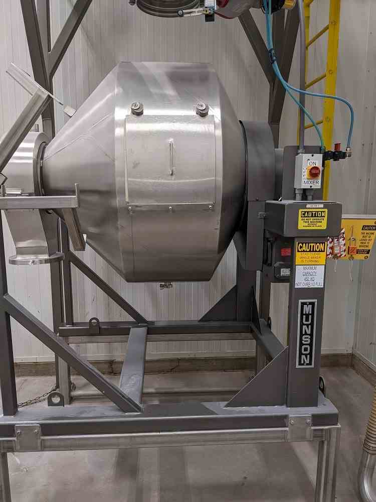 Used 15 Cu Ft Stainless Steel Rotary Batch Mini Mixer. Manufactured by Munson. Model MX-15-SS. Controls. 2HP motor 460/3/60. Serial #170284. with Automated Ingredient Systems hopper and Dump Station with filter and vacuum system. Mounted in frame.