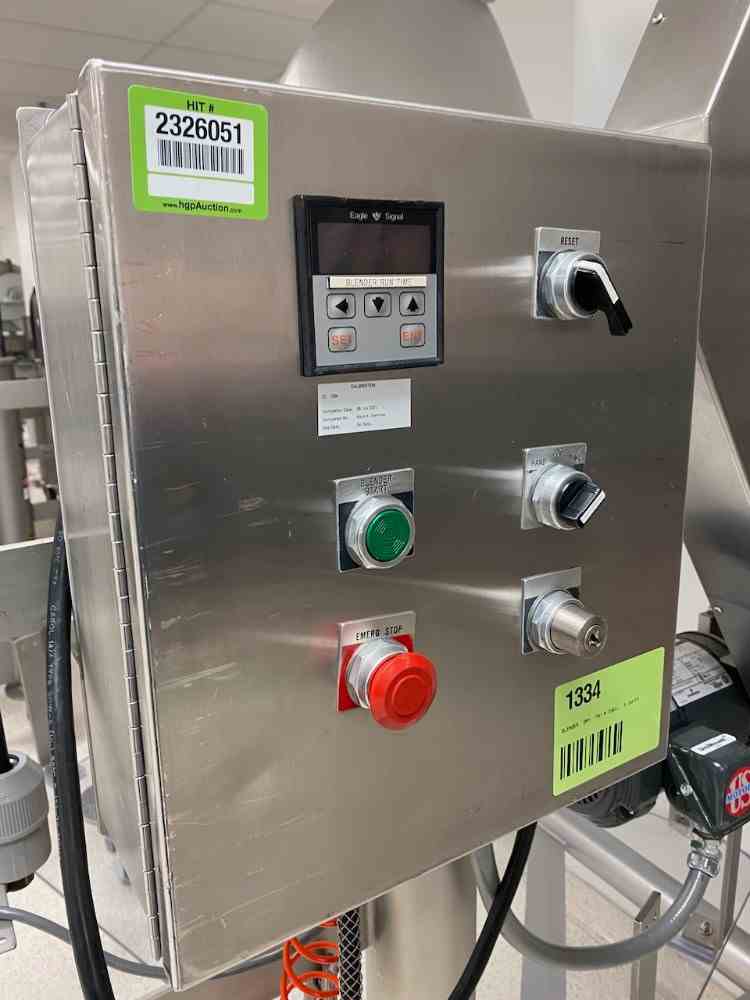 Used 5 Cu. Ft Stainless Steel V-blender. Manufactured by Patterson-Kelley. Model Twin Shell Dry Blender. Max Density 106 lbs/cu ft. 1HP Motor. Covers. Mounted on SS Frame with casters and guards. Serial #C414668-2.