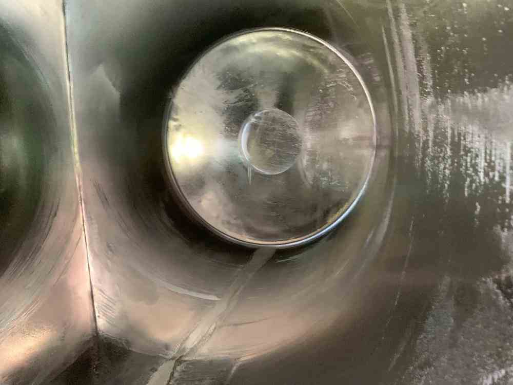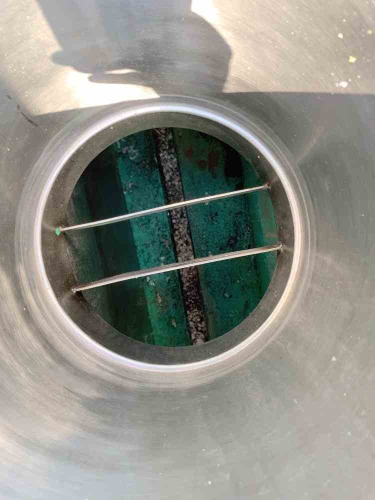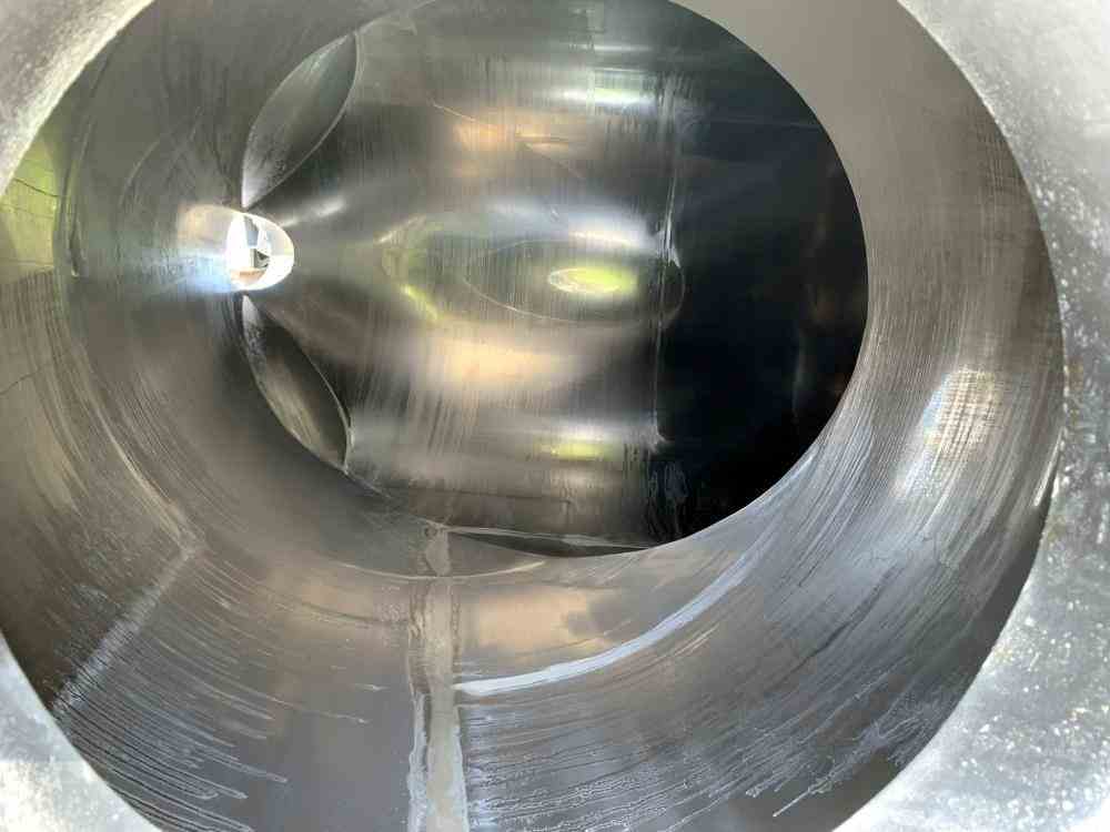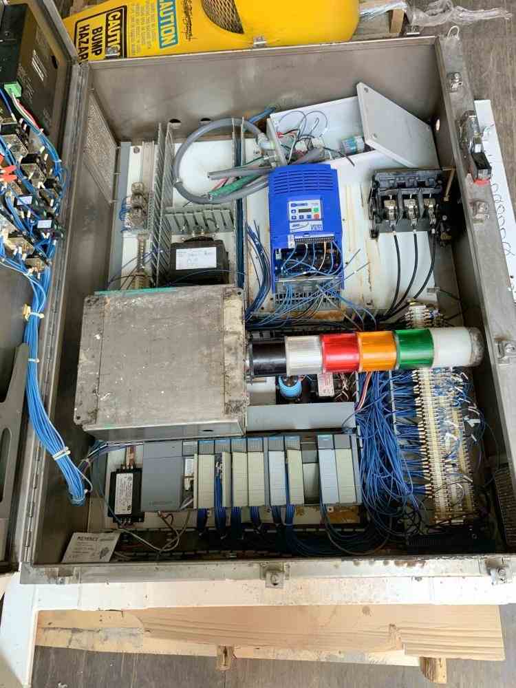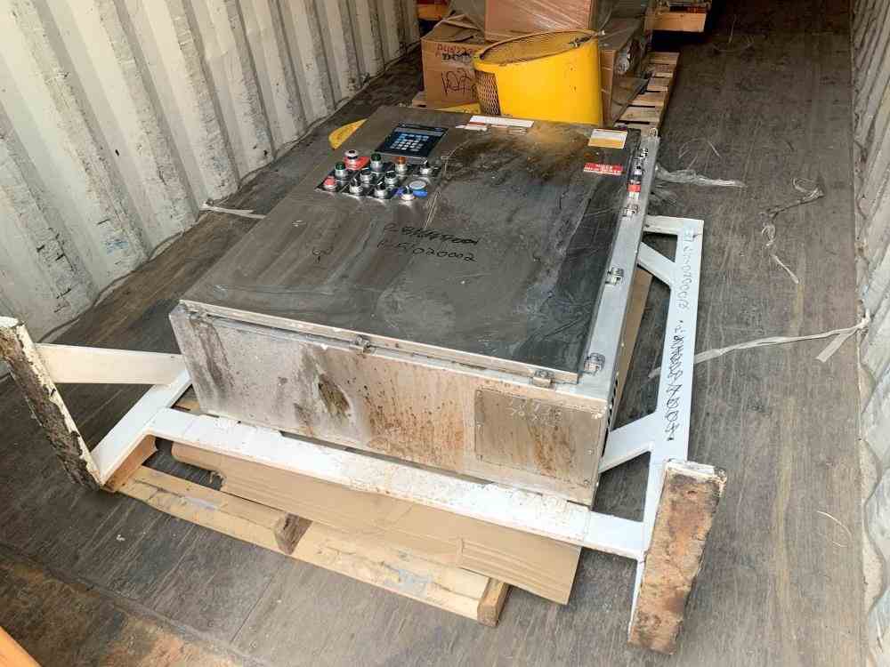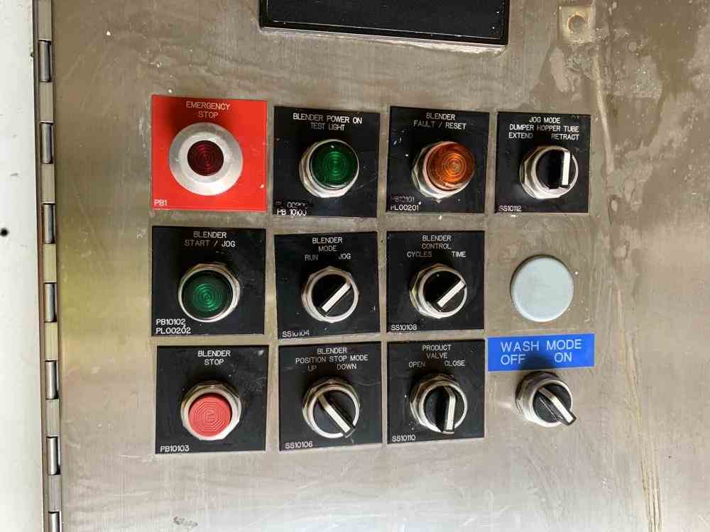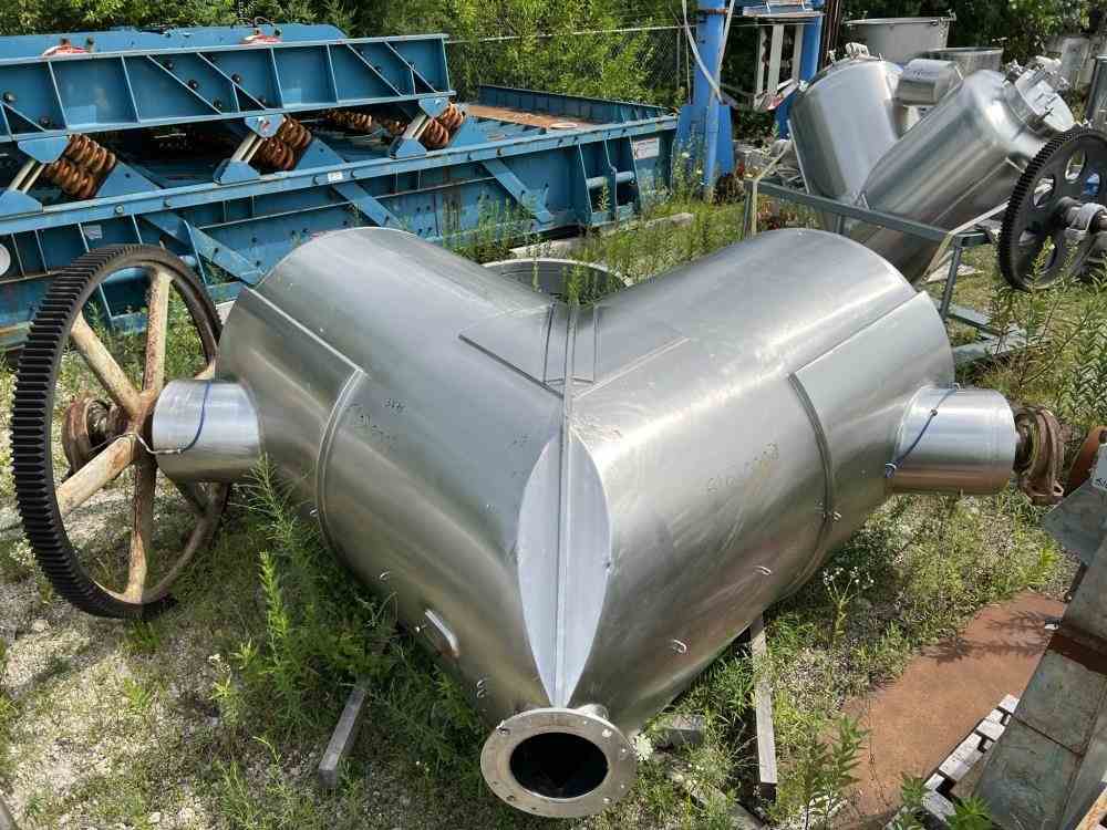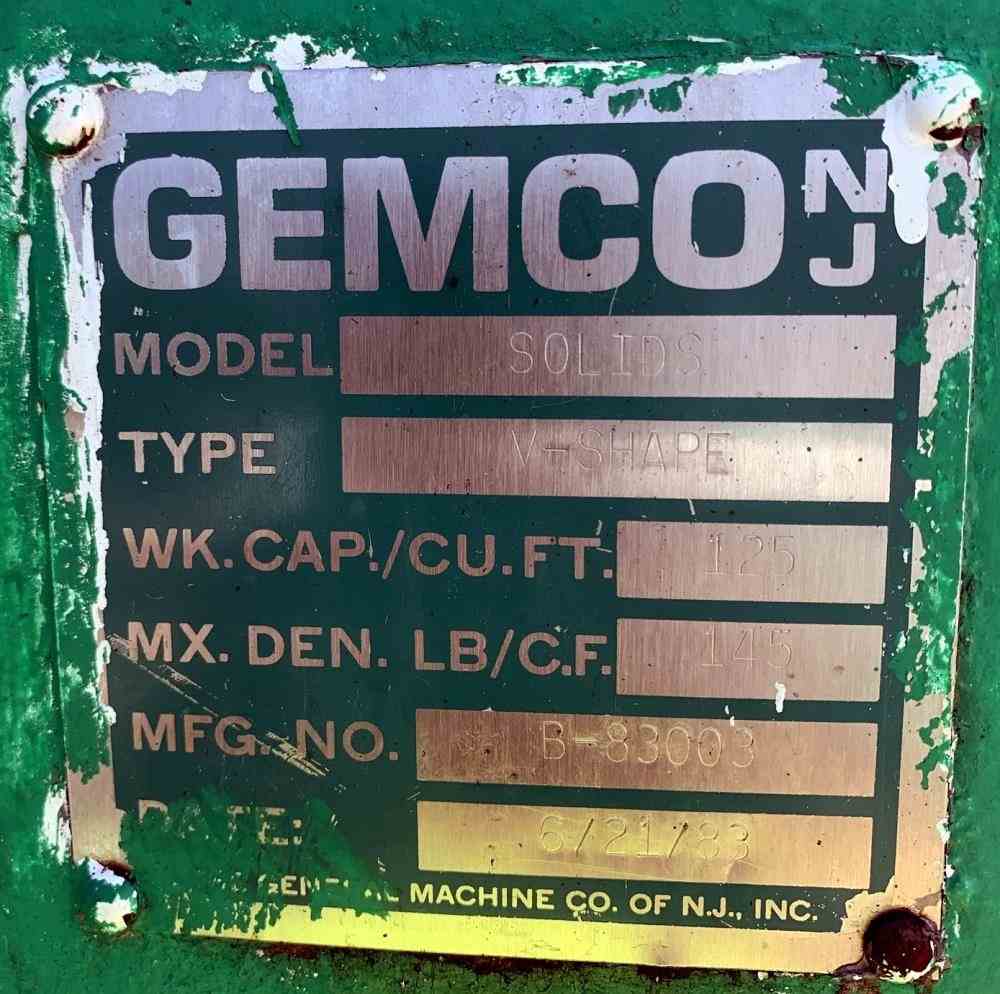 Used 125 Cu ft 316 Stainless Steel Twin Shell Blender. Manufactured by GEMCO. Model Solids. Maximum material density 145lbs/cu ft. 58" diameter x 70" straight side shell. (2) 18" diameter charge ports with covers. Shell driven by 20hp, 3/60/230/460 volt, 1765 rpm motor thru reducer 7:1 ratio. 10" Center bottom outlet. (2) painted carbon steel stands. Discharge Hopper. Control panel with A/B DTAM Plus, Lenze SMVector AC Tech drive. Serial# B-83003. No bottom valve. (Broken down for ease of shipment, can be assembled)