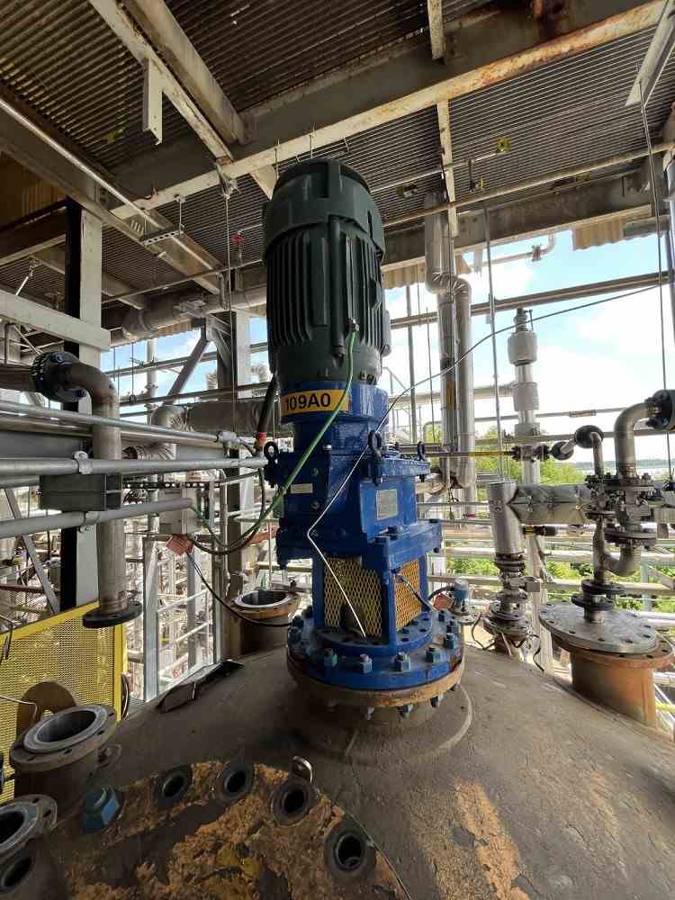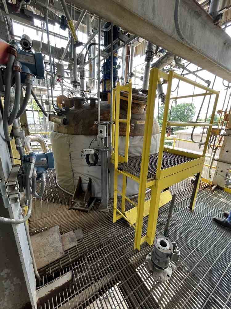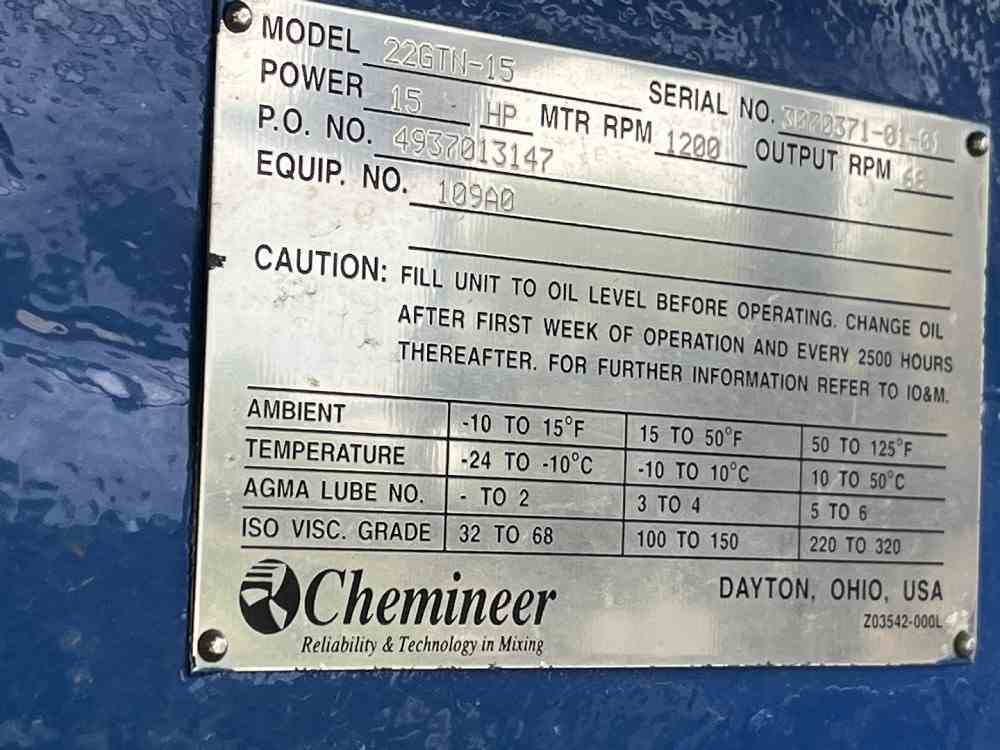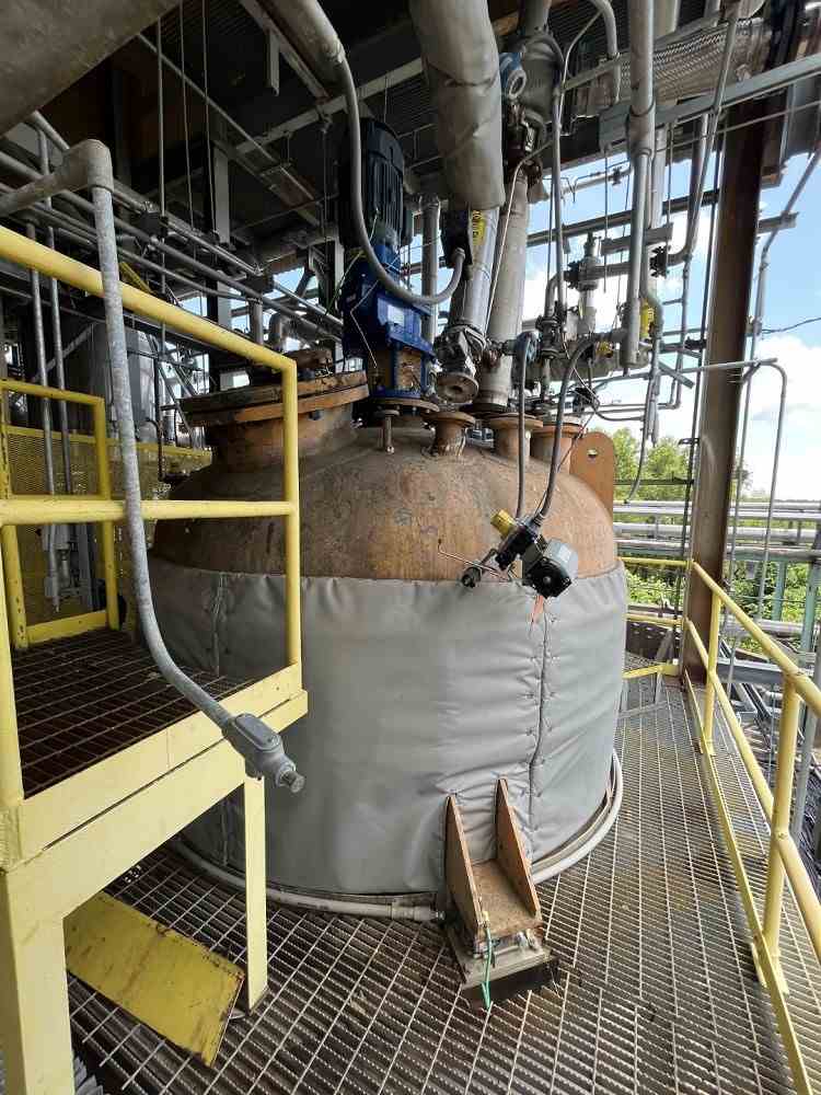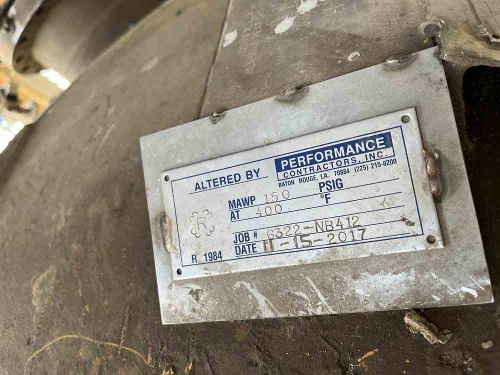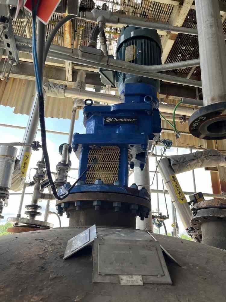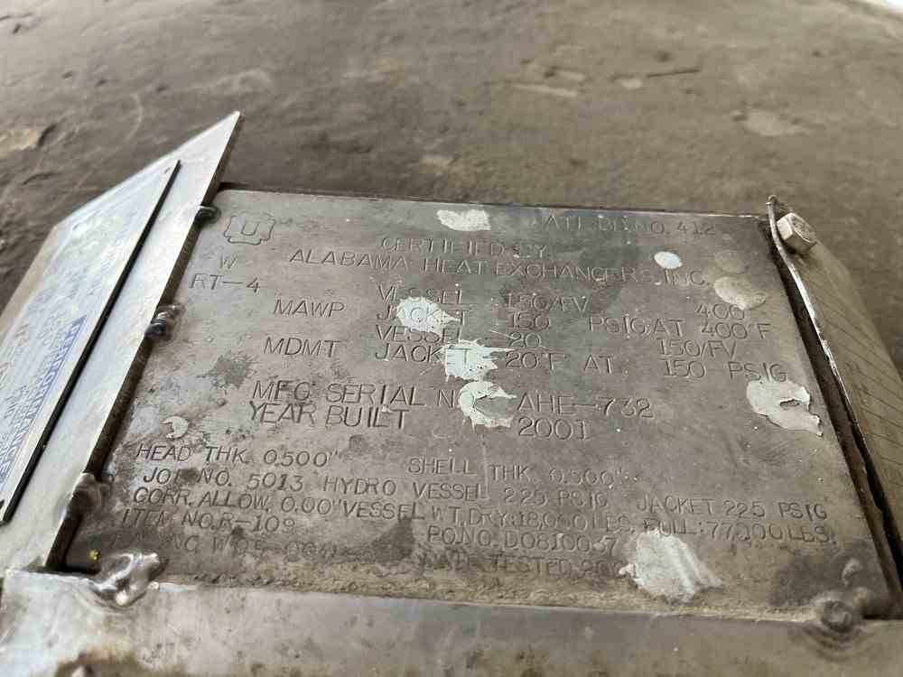 Used 6000 gallon Duplex 2205 Stainless Steel Reactor. Manufactured by Alabama Heat Exchanger. 108"D x 132" straight side. Dome top, dish bottom. Internal MAWP 150 PSI/FV @ 400F. Half-pipe coil jacket MAWP 150 PSI @ 400F. Top entering 15HP Chemineer agitator drive. (4) Side lug mounted. Serial# AHE-732. National Board# 412. Built 2001.