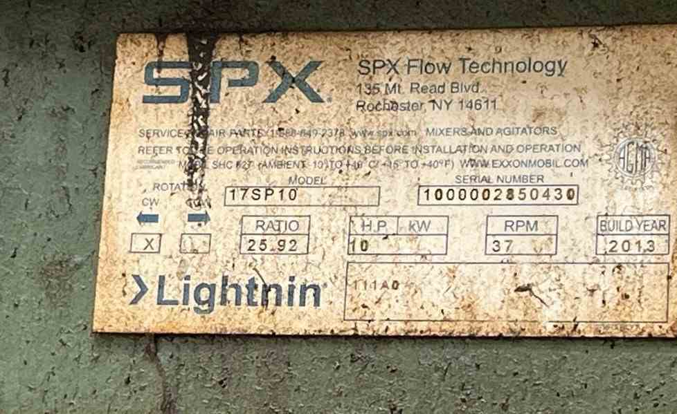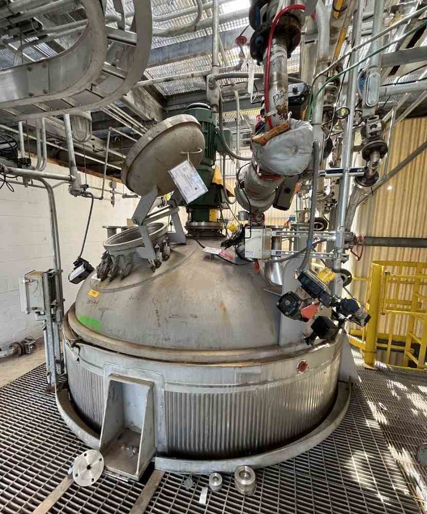 Used 7000 gallon 316 Stainless Steel Jacketed Reactor. Manufactured by Ward Tank. Internal rated 153PSI/FV@400F. 1/2 pipe jacket rated 150PSI/FV @ 400F. 120" diameter x 124" straight side. 2:1 semi elliptical top and bottom. Top entering 10HP Lightnin agitator drive. 24" top manway. Serial# WC-8605. National Board# 4785. Built 2013.