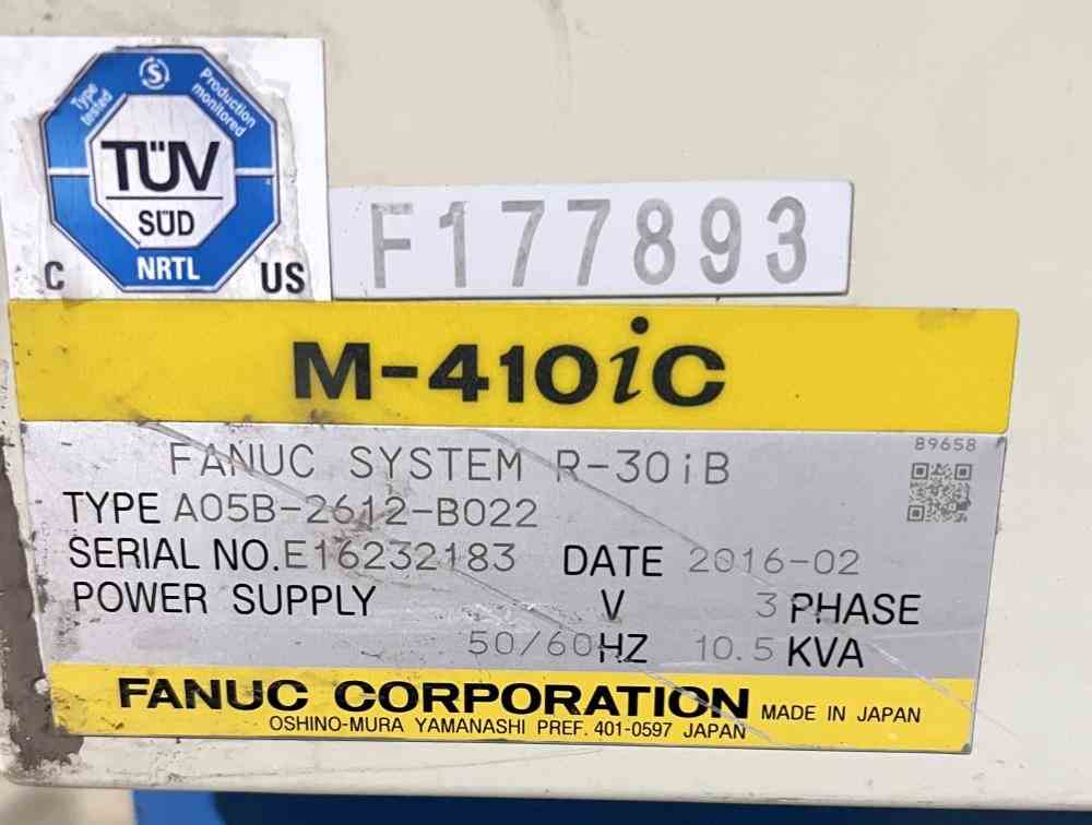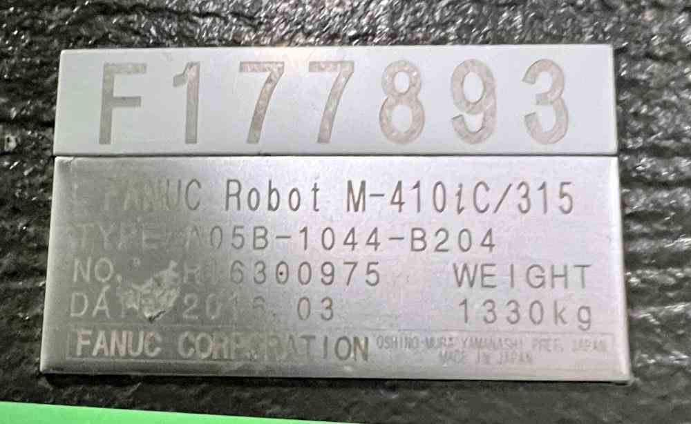 Used Fanuc M-410iC/315 Robotic Arm, Type: A05B-1044-B204. 315kg (694.5lb) Payload at wrist, with 3143mm (124") reach. 4-Axis. 3/60/480 Volts. Compact base. Includes Fanuc System R-30iB controller. Serial# R16300975. Built 2016.