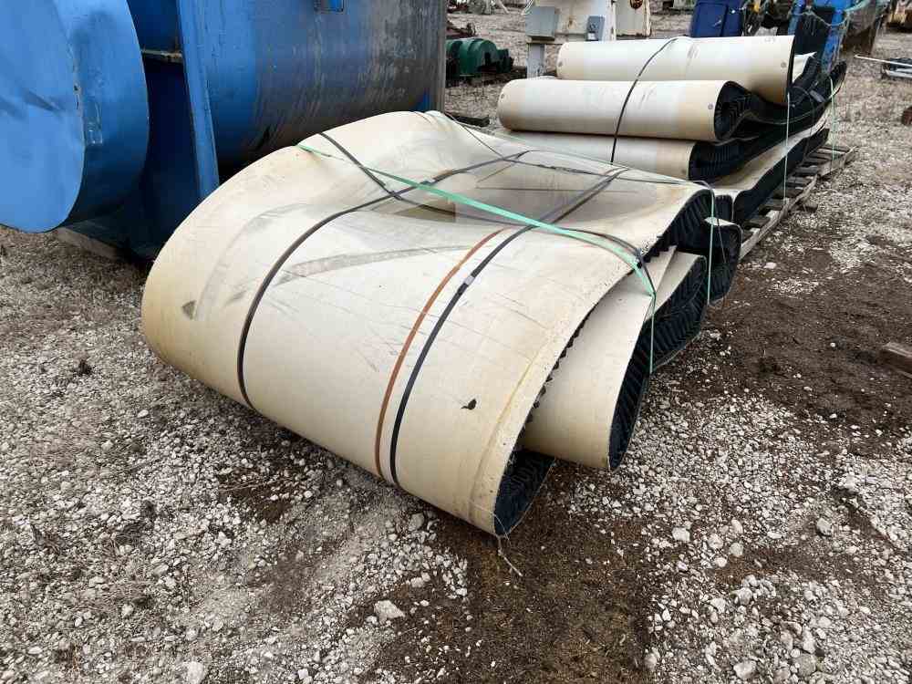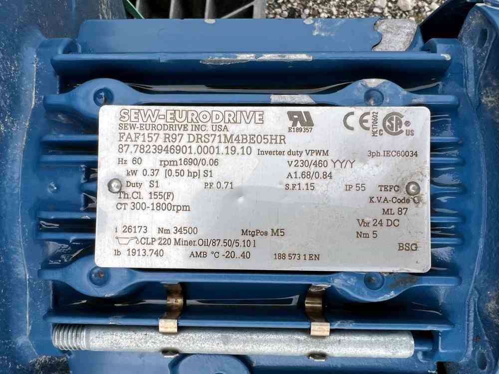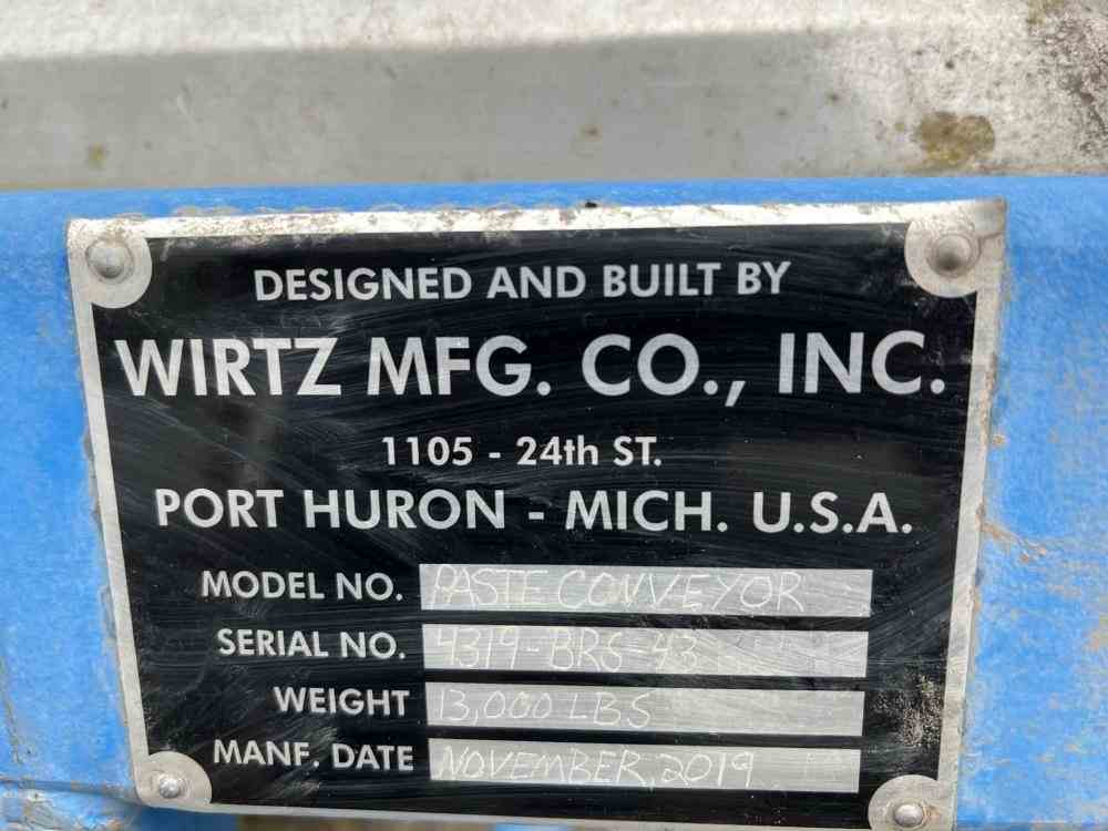 Used 310" long x 44" wide conveyor. Manufactured by Wirtz. Driven by a 1/2hp 3/60/230/460v 1690rpm motor through a reducer. Serial# 4319-BRS-43, built 2019. Missing Guard.