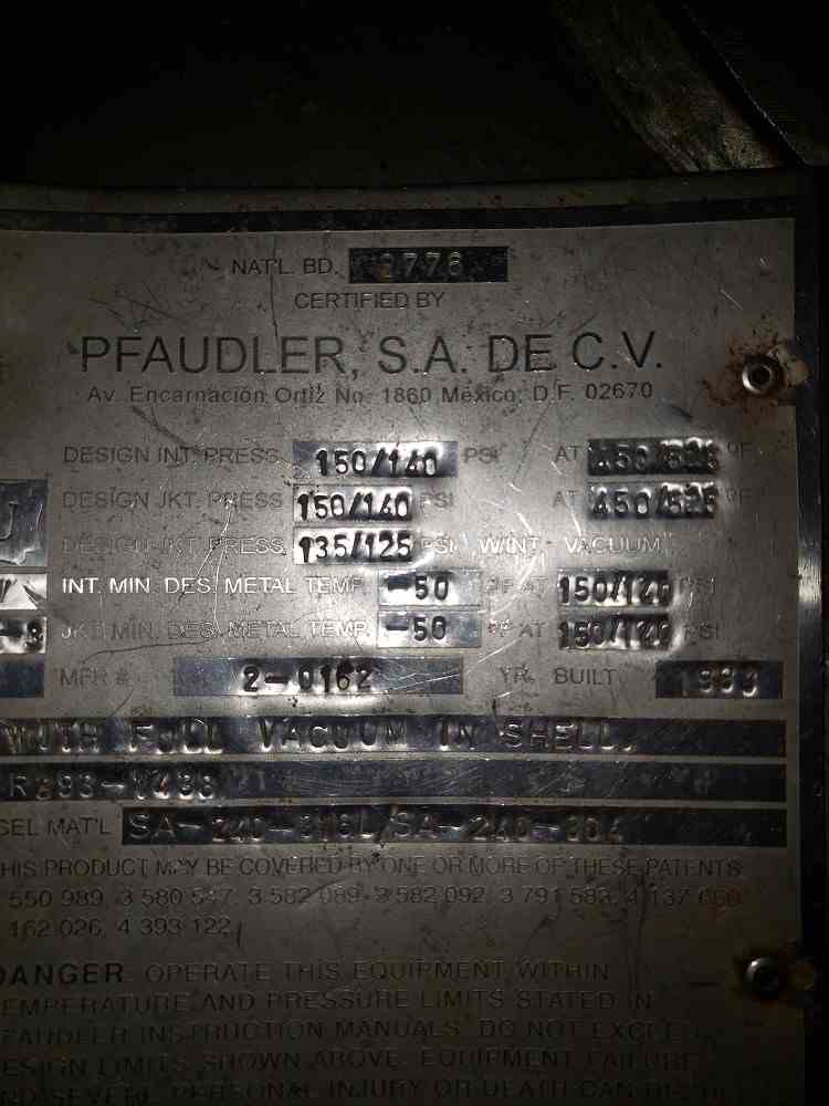 Used 750 Gallon 316L Stainless Steel Reactor. Manufactured by Pfaudler. Internal rated 150 PSI/FV@525F. Jacket rated 150/FV@525F. 10 HP Turbine agitation. National Board #1776. Serial #2-0162. Built 1994.