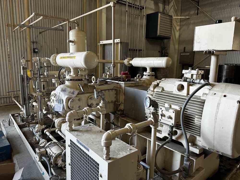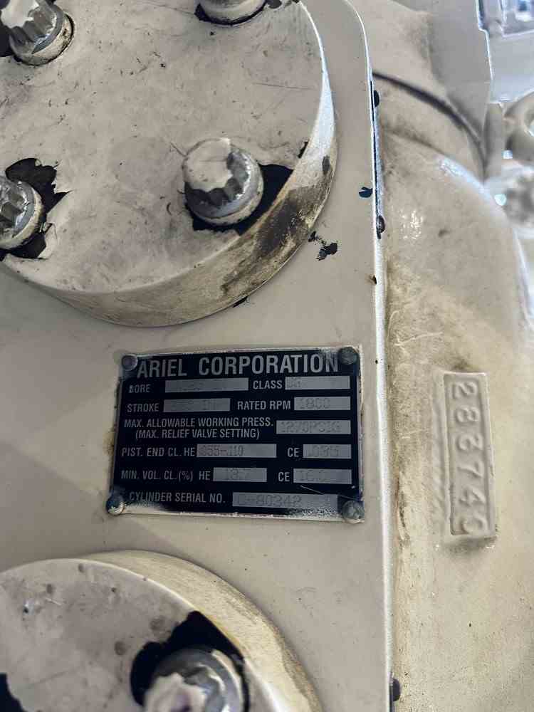 Used overhead compressor skid consisting of (2) Ariel JGQ/2 Compressors. MAWP 1270 PSIG. Size 4.125" Bore x 3" stroke. GE Gemin 125HP TEFC motor Frame 444. Skid includes Tesi Scrubber with Mist Pad. Size 12.75" OD x 72" S/S. MAWP 645PSIG @200F. Ace E24-2.5 375 Sq Ft 6-pass Aftercooler. MAWP 1287PSIG@350F. Air Cooled Exchangers Forced Draft Model E24-2.5 Heat Exchanger. 5027 SFCM. 1HP fan. Lube oil cooler motor, filter, pump. Built 2007. Skid dimensions 149 5/16" x 90" x 80 13/16". Empty weight 19500 lbs. Past use: Dew Point Control Plant, Overhead compressor.