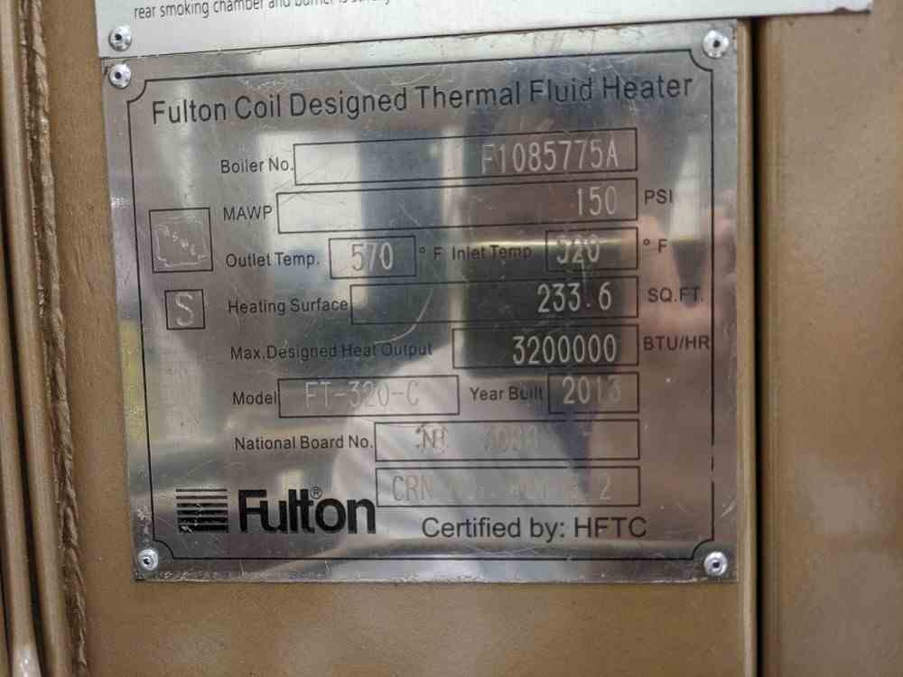 Unused 3.2MM BTU/Hr Thermal Fluid Heater. Manufactured by Fulton. Model FT-320-C. MAWP 150 PSI. 570F outlet, 329F Inlet. 40HP pump. Deaerator. Serial @#F1085775A. National Board#3088. Built 2013.