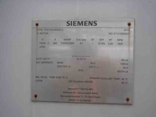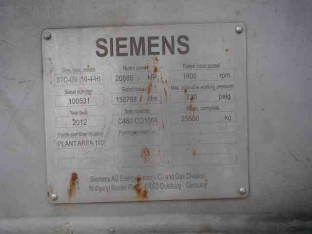 Used 150788 CFM Centrifugal Compressor. Manufactured by Siemens. Model STC-GV(16-4-H). 20866 HP. MAWP 730PSI. Serial #100531. Built 2012. Motor: 23065 HP. 1800RPM. 13200V. 0.90 PF. Includes CO1004-HX1 and Lube Oil Console. Past use: Extraction Air Compressor. (2) Compressors available.
