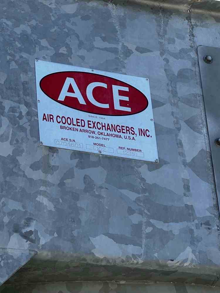 Used 409 sq ft Fin Fan heat exchanger. Manufactured by ACE Inc. Model E102-15. Belt drive fan with 20 HP, 460V/3Phase/60Hz motor. 150 psig design pressure @350F max temperature. Serial #0704601. Built 2007. Part of Stock #19960 - Compressor skid.