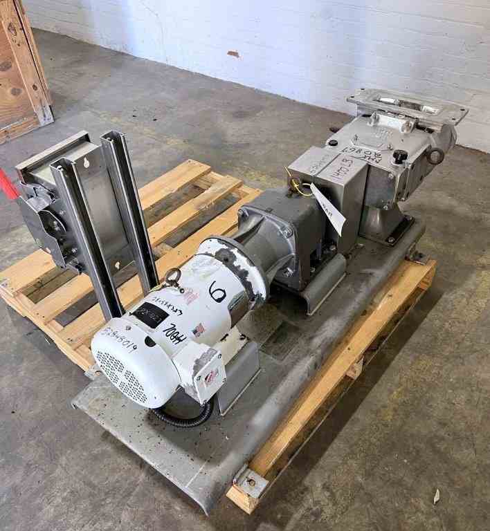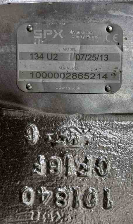 Used 5HP Rotary Positive Displacement Pump. Manufactured by SPX Waukesha. Model 134 U2. 101 gpm, 300psi max pressure. 3.19" x 9.38" inlet, 3" outlet. Driven by a 5hp 3/60/208-230/460v 1750rpm motor. Built 2013. Serial# 1000002865214.