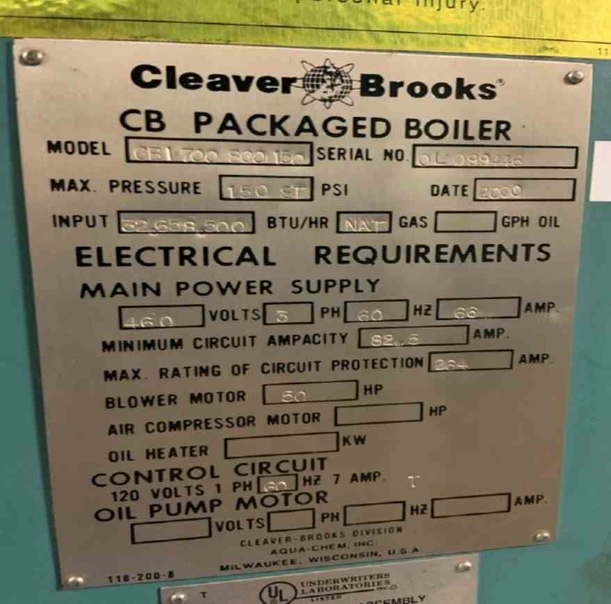 Used 800 HP Cleaver-Brooks Packaged Steam Boiler. Manufactured by Cleaver Brooks. Model CBI-700-800-150. 800HP. MAWP 150PSI Steam. Natural Gas fuel. 50 HP blower. Serial #0L099446. Built 2000.