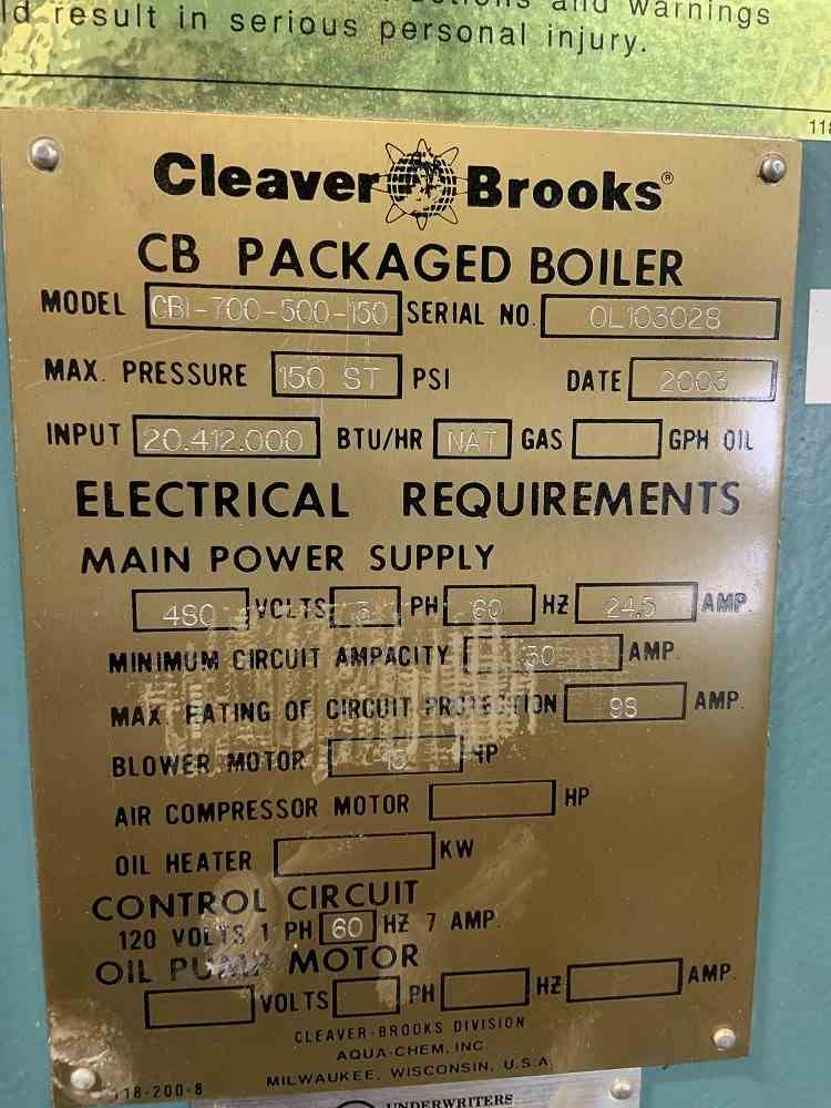 Used 500HP Steam Package Boiler. Manufactured by Cleaver-Brook. Model CBI-700-500-150. 500 HP. MAWP 150 Steam. Natural Gas burner. 150 HP blower. Serial #0L103028. Built 2003.