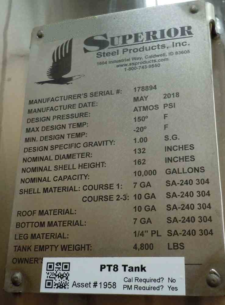 Used 10000 gallon 304 stainless steel tanks. Manufactured by Superior Steel Products, Inc. ATM @150F. Cone bottom with sanitary ports. (4) Leg mounted. Serial #178894. Built in 2018. Used to store agricultural use bacteria. (3) tanks available.