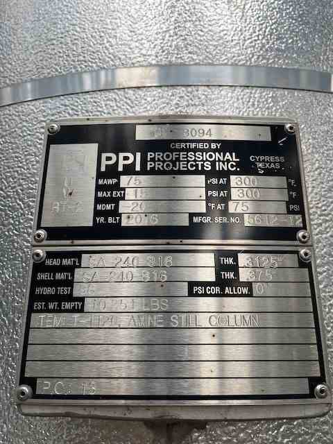 Used 35" diameter 316 Stainless Steel Packed Column. Manufactured by Professional Projects. 35" diamter x 35'0" T/T. 75 PSI @ 300 F. 4' Skirt Support. 3/8" Wall Thickness. Serial # 5612-12. National Board #3094. Built 2016. Previous Service: Amine Regenerator. Not Skidded.