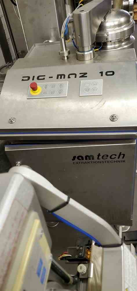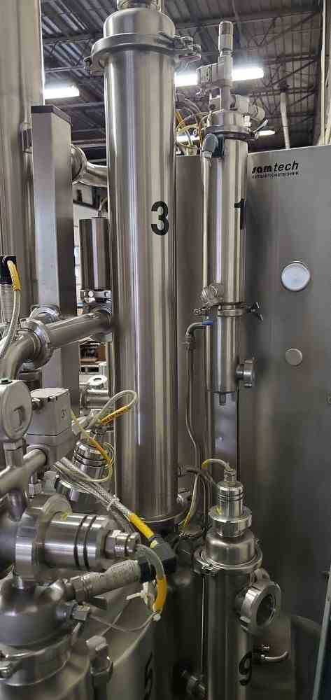 Used 4.5 Sq. Ft Stainless Steel Wiped Film Evaporator Extraction Plant. Manufactured by Samtech (Austria). Model Dig-Maz-10 ExKA. 4.5 sq Ft Wiped Film Evaporator, 10 Liter Self Cleaning Extractor/Percolator, Scraper Agitated Product Feed Tank, Condensor, Solvent recovery system, capable of doing liquid/solid and liquid liquid extraction. Rated 8 Bar (115 PSI) int @ up to 120 C (248 F). Rated app. 4 liter per min depending product characteristics.