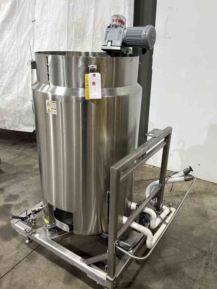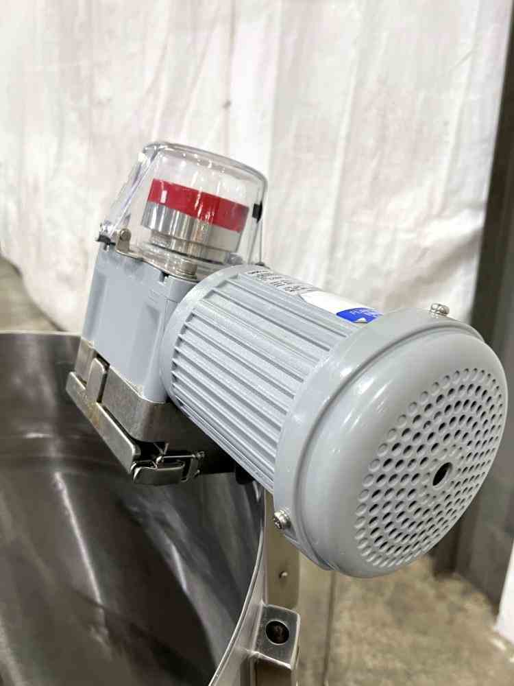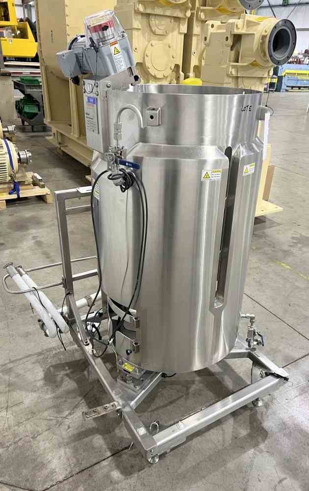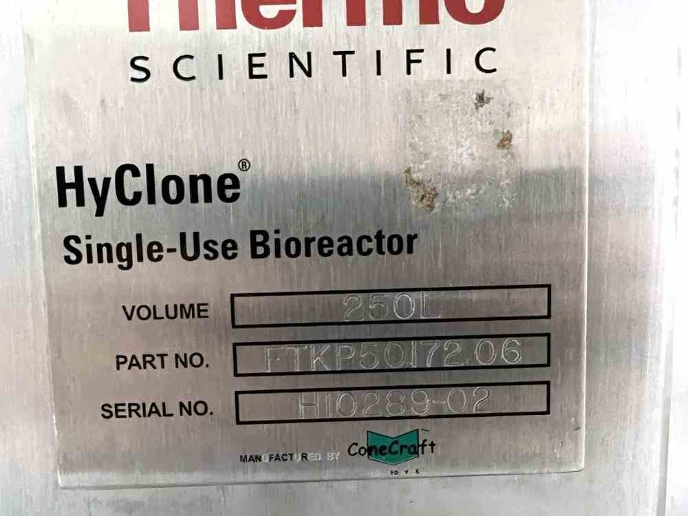 Used 250L Stainless Steel Single Use Bioreactor. Manufactured by Thermo Scientific. Model HyClone. Open top, flat bottom shell. 24" diameter x 36" straight side. Dimple Jacket. Operating Temperature Range: Ambient to 104F. 0.5psi Bag Pressure. Includes AB Series A Drive, Brother 3 phase induction motor, 1/4hp 3/60/208-230/460v 1720rpm, 12.5:1 Ratio. Mounted on Stainless Steel Frame. Serial# H10289-02.