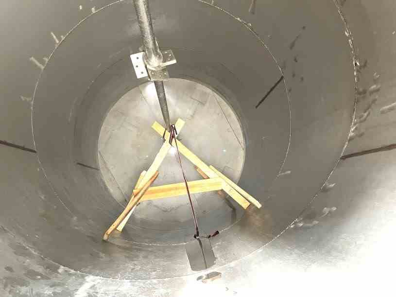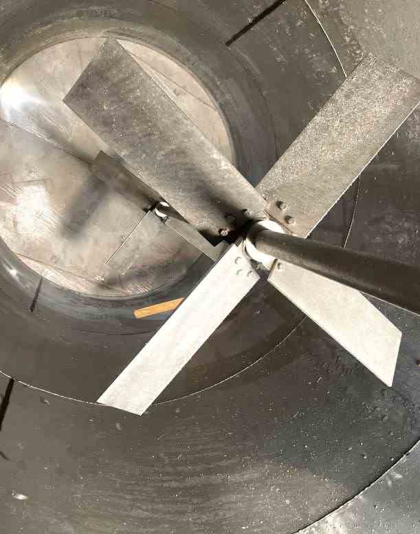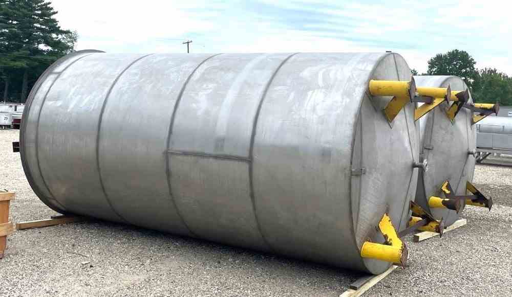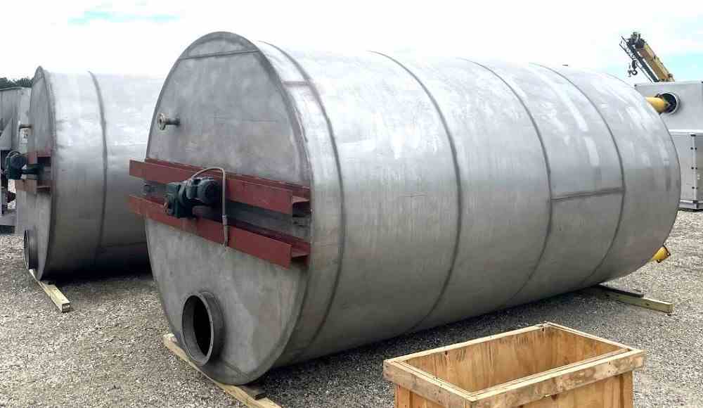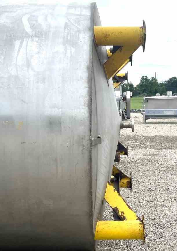 Used 8000 gallon Stainless Steel Cone Bottom Mix Tank. Flat Top. 9' dia.x 17' T/T. Approx 20'6" OAH. 2" Center bottom outlet. Top mounted 1 HP, 1725/1425 RPM, 230/460 volt motor into Grove gear reducer with 125:1 ratio. (2) Sets of mixing blades. Top has a 20" manway and 2" connection.