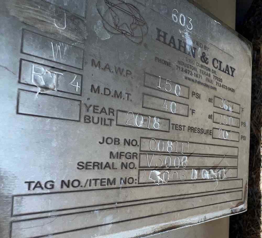 Used 2000 gallon 304L Stainless Steel vertical Pressure vessel. Manufactured by Hahn and Clay. 5'D X 12'H. Dish top and cone bottom. 6" diameter center bottom on cone bottom, (1) 6" and (6) 2" openings along straight side, and (1) 8", (1) 6", (1) 3" and (2) 2" flange connections in top head. Rated 150 PSI @366F. MDMT 40F @ 150 PSI. National Board #603. Serial # V3006. Built 2018. Designed as digester tank for making probiotics.