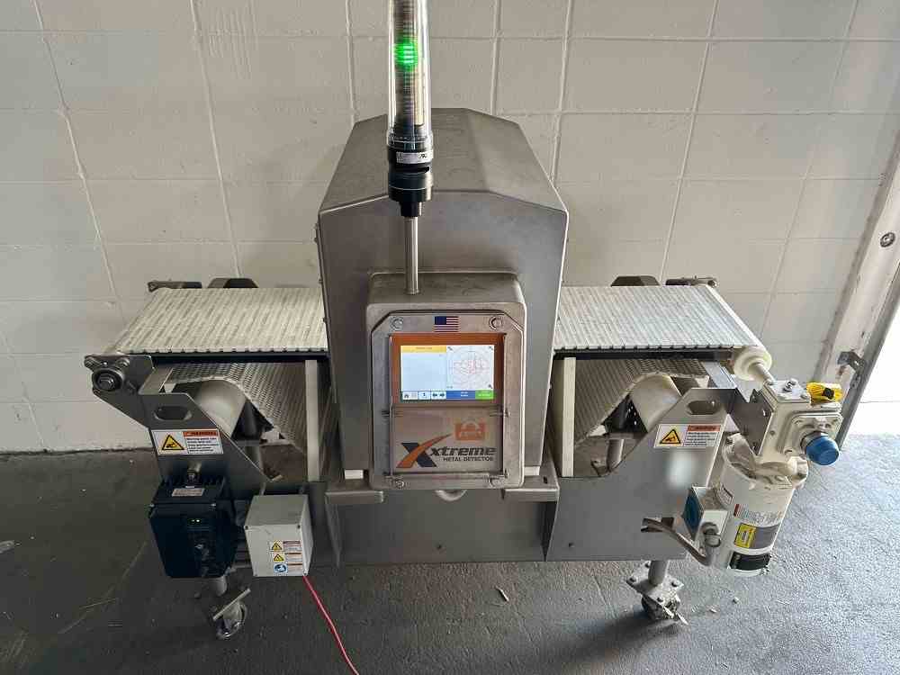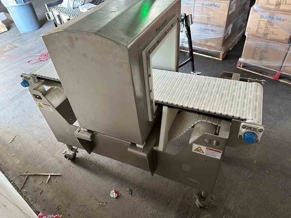 Used Eriez X7 Xtreme Metal Detector with Conveyor. X7 Tunnel 14"W x 12"H with 60" x 12" Conveyor (L to R travel). Stop Belt reject. 304 SS. Viewing HMI. on casters.