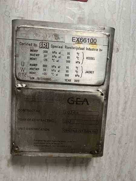 Unused 3000 Gallon (11.5 m3) 304L Stainless Steel Double Wall Crystallizer. Manufactured by GEA. Jacketed. Internal rated -2.90/43 psi ( -.2/3 BARG) @-13F/203F (@-25C/95C), jacket rated -7.25/43psi (-.5/3 BARG) @-13F/203F (@-25C/95C). 18.5kW motor with top mounted side scraper agitation. 84" dia x 20' tall. NB #1265, Serial #091212096C, Weight 13000 lbs. Built 2013. Previous use: Crystallizer Stage 1 in GEA freeze concentration plant.