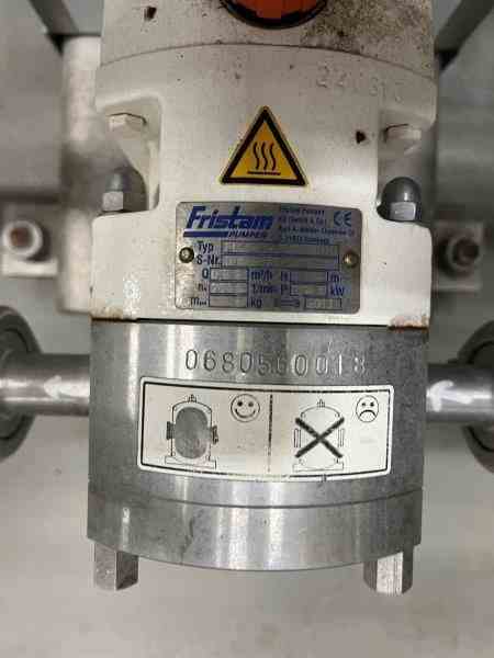 Unused 3 HP rotary lobe stainless steel pump. Manufactured by Fristam. Model #FL-55-S. 0.36 m3/hr capacity, 1735/263 r/min1 drive speed, 227/480V. 1" X 1" size. Previous use: Product output pump in GEA freeze concentration plant.