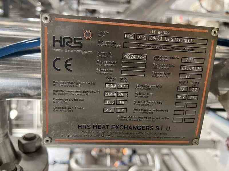 Unused 12.7 liter corrugated tube stainless steel heat exchanger. Manufactured by HRS. Model DTA 89/60. Shell material 316L, 253 psi (17.5 bar) max pressure @401F (205C), tube material 304SS, 217 pai (15 bar) max pressure @140 F (60C). Serial #P09741/2-1. Built 2013. Previous use: Product heater in GEA freeze concentration plant.