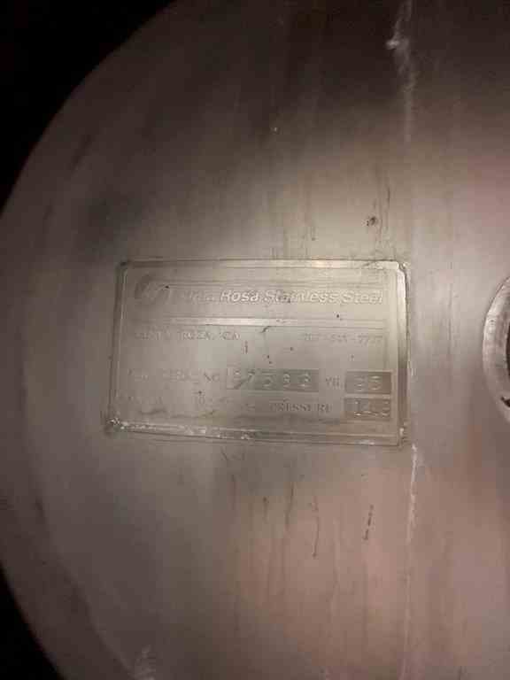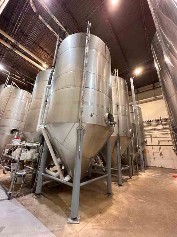 Used 150 BBL (4650 Gallon) Vertical Cone Bottom 304 Stainless Steel Jacketed Vessel. Manufactured by Santa Rosa Stainless Steel in 1995. Serial #97533. Jacket designed for 14.8 psi. 19'3"Tall x 8'10" Dia. Spray ball CIP, cone bottom, dished top. Weight 5866 lbs Previous Use: 150BBL Jacketed/Insulated Unitank for Beer Fermentation.