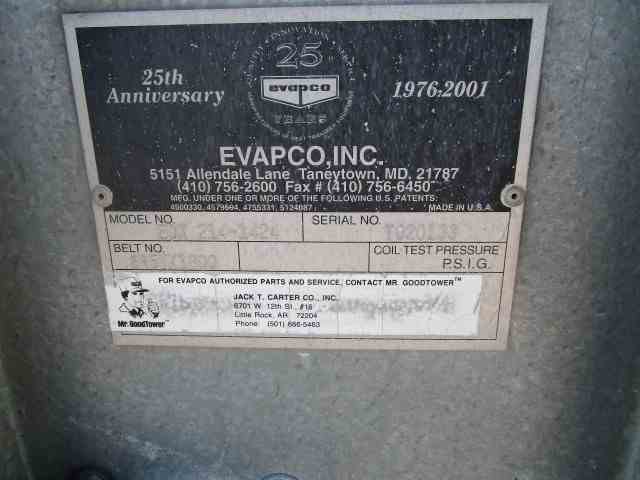 Used 850 ton cooling tower. Manufactured by Evapco. Model #EDX 214 1424. Induced draft crossflow. 304 Stainless basin and galvanized casing. Double stacked. Serial #T020133. Built 2002. Shipping Dimensions: Top 22'L x 13'8"W x 9'5"H. Bottom 22'L x 13'8"W x 9'5"H