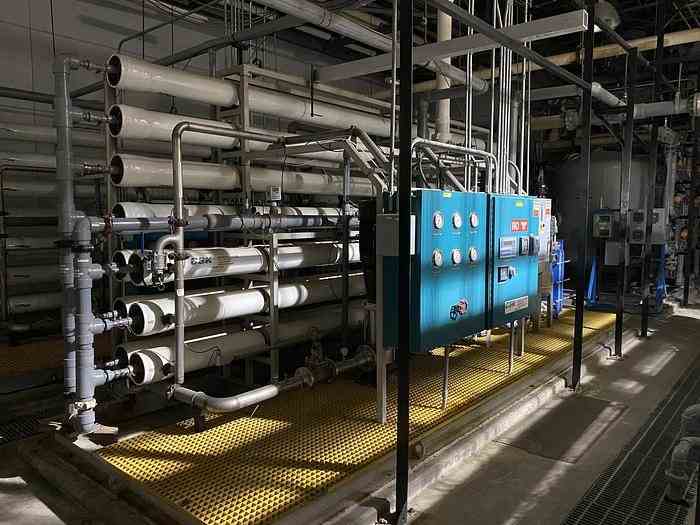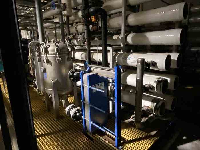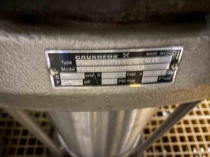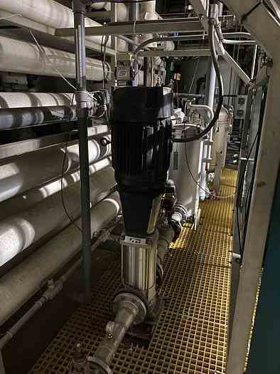 Used 250 GPM Reverse Osmosis Skid. Manufactured by CSK. Rated 250 GPM. System includes: (10) Code Line membrane housings, controls, (2) stainless steel pre-filters, (1) plate exchanger to maintain the feed temperature, (1) 40HP Grundfos vertical pump rated 350 GPM. (3) Available.