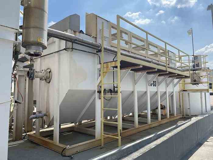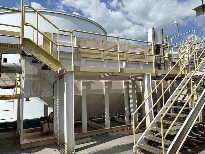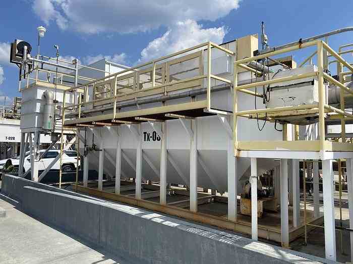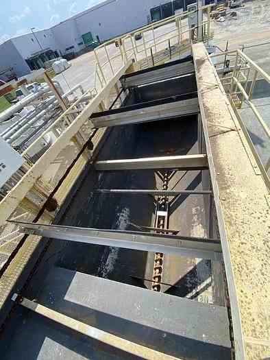 Used 10000 gallon carbon steel horizontal Dissolved Air Flotation (DAF) unit. Includes top rakes with motor and drive, full-length bottom screw with motor and drive. 25' long X 7' wide X 7'-6" deep. Ladder and side access platform.