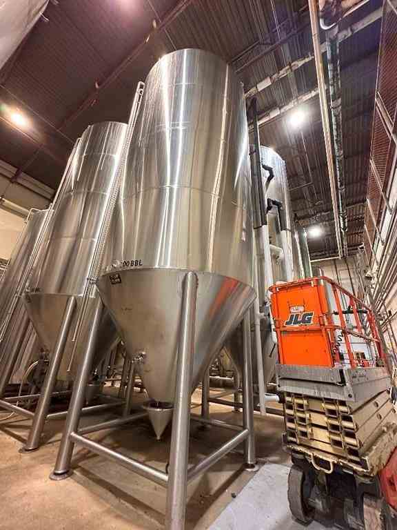 Used 200 BBL (7991 gallon) Vertical Cone Bottom 304 Stainless Steel Jacketed Vessel. Manufactured by JV Northwest (ICC). Serial #19091 - stamp only (no dataplate, no ASME/UM/National Board stamp). Spray ball CIP, cone bottom, dished top. Previous Use: 200BBL Jacketed/Insulated Unitank for Beer Fermentation
