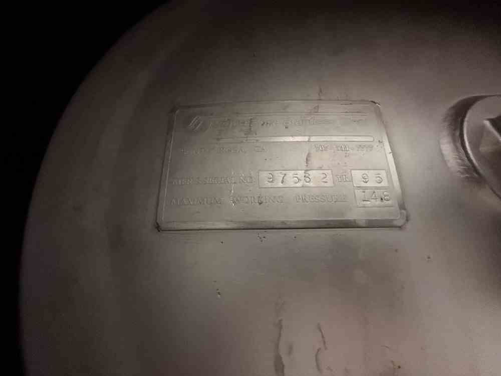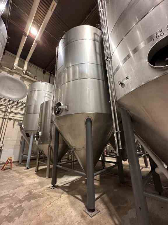 Used 150 BBL (4650 Gallon) Vertical Cone Bottom 304 Stainless Steel Jacketed Vessel. Manufactured by Santa Rosa Stainless Steel in 1995. Serial #97562. Jacket designed for 14.8 psi. 19'3"Tall x 8'10" Dia. Spray ball CIP, cone bottom, dished top. Weight 5866 lbs Previous Use: 150BBL Jacketed/Insulated Unitank for Beer Fermentation