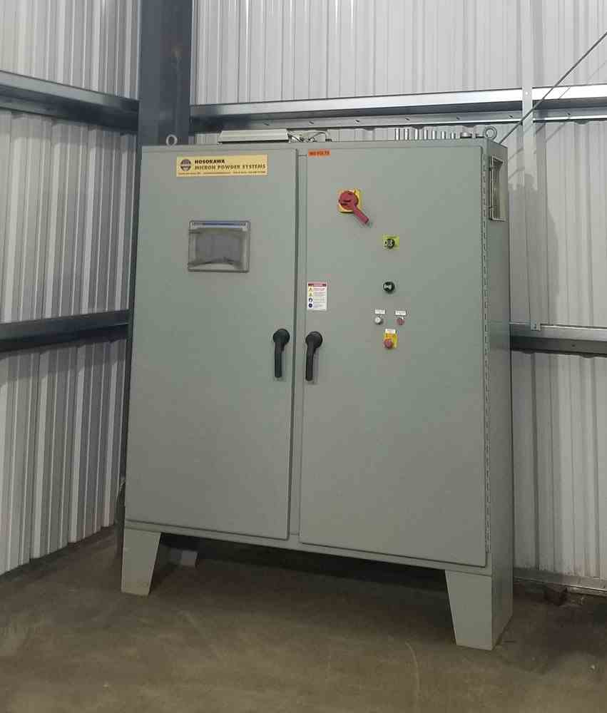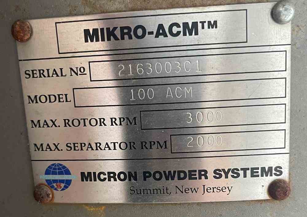 Used Mikro-ACM Model 100 Closed-Loop Milling System. Manufactured by Hosokawa Micron. Includes Used 100HP Mikro-ACM Air Classifying mill. Manufactured by Hosokowa Micro. Model 100. Tungsten carbide tipped rotor. Ceramic liner. Constant speed 100HP motor. 15HP Variable speed classifier motor with speed pick-up assembly for classifier. Gravity-drop feed assembly. Mikro-ACM 75 feeder with rotart air lock. Rectangular product collector, 100ACM system blower, heat exchanger. Controller with NEMA 4 enclosure.