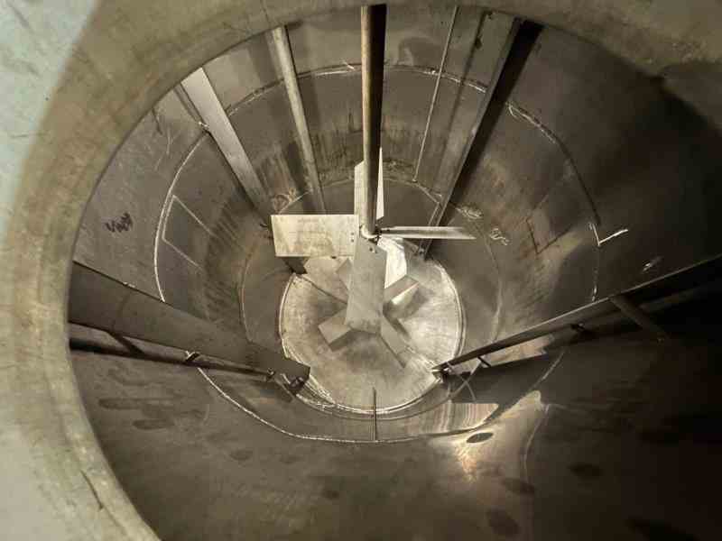 Used 4800 gallon Vertical 316 stainless steam jacketed mixing tank. Insulated. Top Mounted Agitation, (4) Internal Sidewall Baffles, Flat Flanged Top & Dished Bottom.