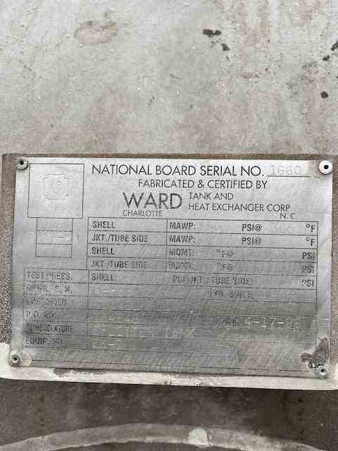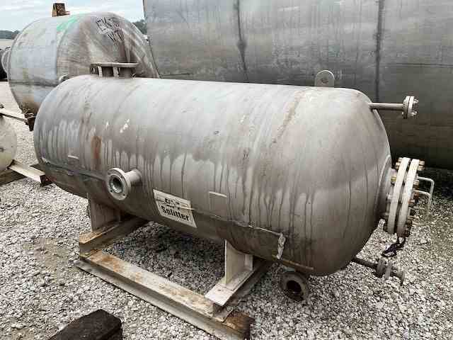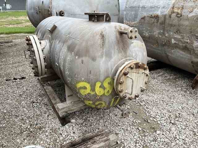 Used 500 gallon 316 stainless steel horizontal pressure vessel. Manufactured by Ward. 42" dia x 80" tall. Rated 150 psi @365F. Dished Top & Bottom Heads. Built 1996.